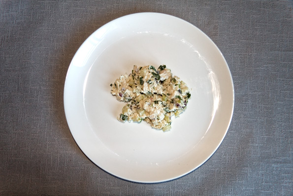 Куриная грудка (с кожей и костью — так вкуснее), предназначенная для салата, была упакована в вакуумный пакет вместе с веточками тархуна и долькой лимона. Температура приготовления — 65 градусов, время — 1 час. Среди компонентов салата — домашний майонез, петрушка, лук порей и красная луковица, сельдерей, чеснок.