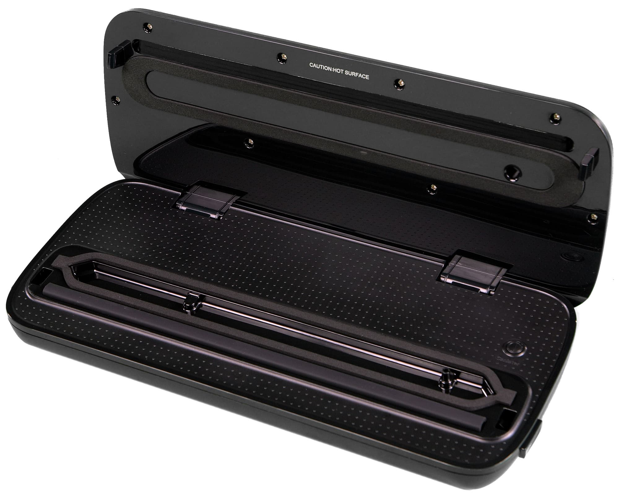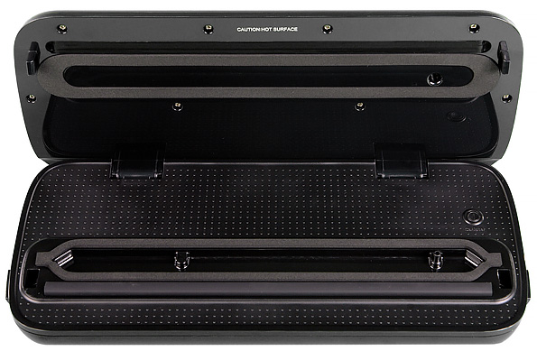 Корпус вакууматора выполнен из черного глянцевого пластика высокого качества. Снизу можно увидеть резиновые ножки, препятствующие скольжению. По бокам расположены подпружиненные кнопки, фиксирующие крышку устройства.