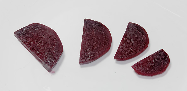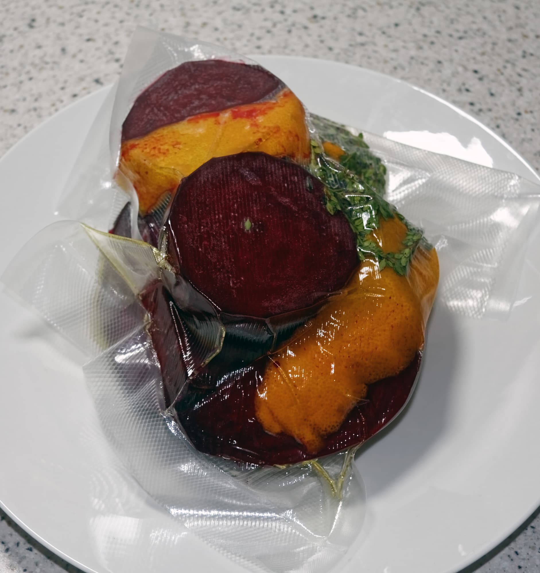 Свекла была почищена и помещена в вакуумные пакеты вместе с остальными ингредиентами. Время приготовления — от 1 до 5 часов (в зависимости от размеров овоща и желаемой степени мягкости, мы выбрали средний вариант — 3 часа), температура воды — 85 градусов.
