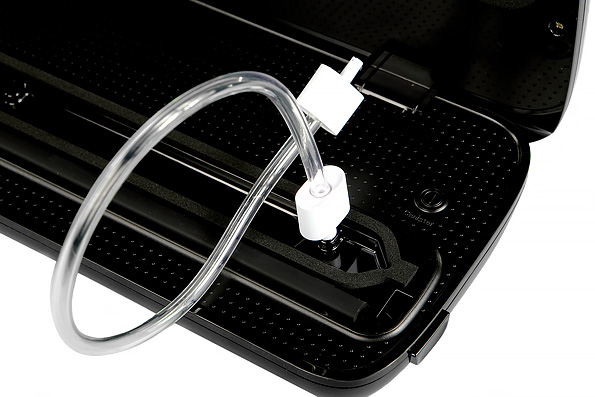 Дополнительная механическая кнопка, расположенная под крышкой устройства, позволяет вакуумировать контейнеры с помощью специального шланга-переходника. Откачка воздуха будет продолжаться до тех пор, пока кнопка остается зажатой.