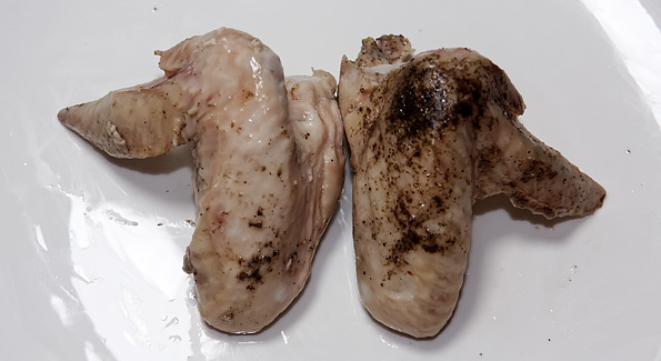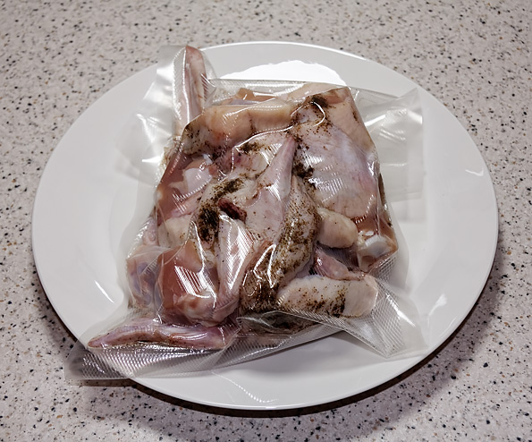 Куриные крылышки нужно приправить солью и перцем, вакуумировать, после чего отправить пакет в мультиварку или су-вид, предварительно разогретый до 64 °C, на 2 часа.