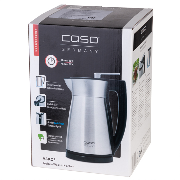 Торговая марка Caso зарегистрирована в 2003 году и принадлежит компании Braukmann GmbH — крупному немецкому дистрибьютору бытовой и кухонной техники. Марка не имеет собственных заводов, заказы размещаются на контрактных предприятиях по всему миру, география которых достаточно стандартна: Китай, Турция, страны Восточной Европы. Чайники делаются в Китае. Герой сегодняшнего обзора — самый обычный электрический чайник, обеспечивающий только один температурный режим: кипячение. Интрига же состоит в том, что корпус чайника по сути представляет собой термос, то есть VakO² должен ощутимо лучше, чем обычные чайники, сохранять температуру воды в течение длительного времени.