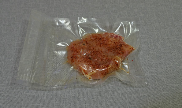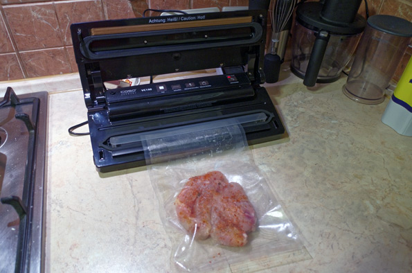 Куриную грудку посолили и обмазали специями, затем упаковали в вакуум с помощью Caso VC 150.