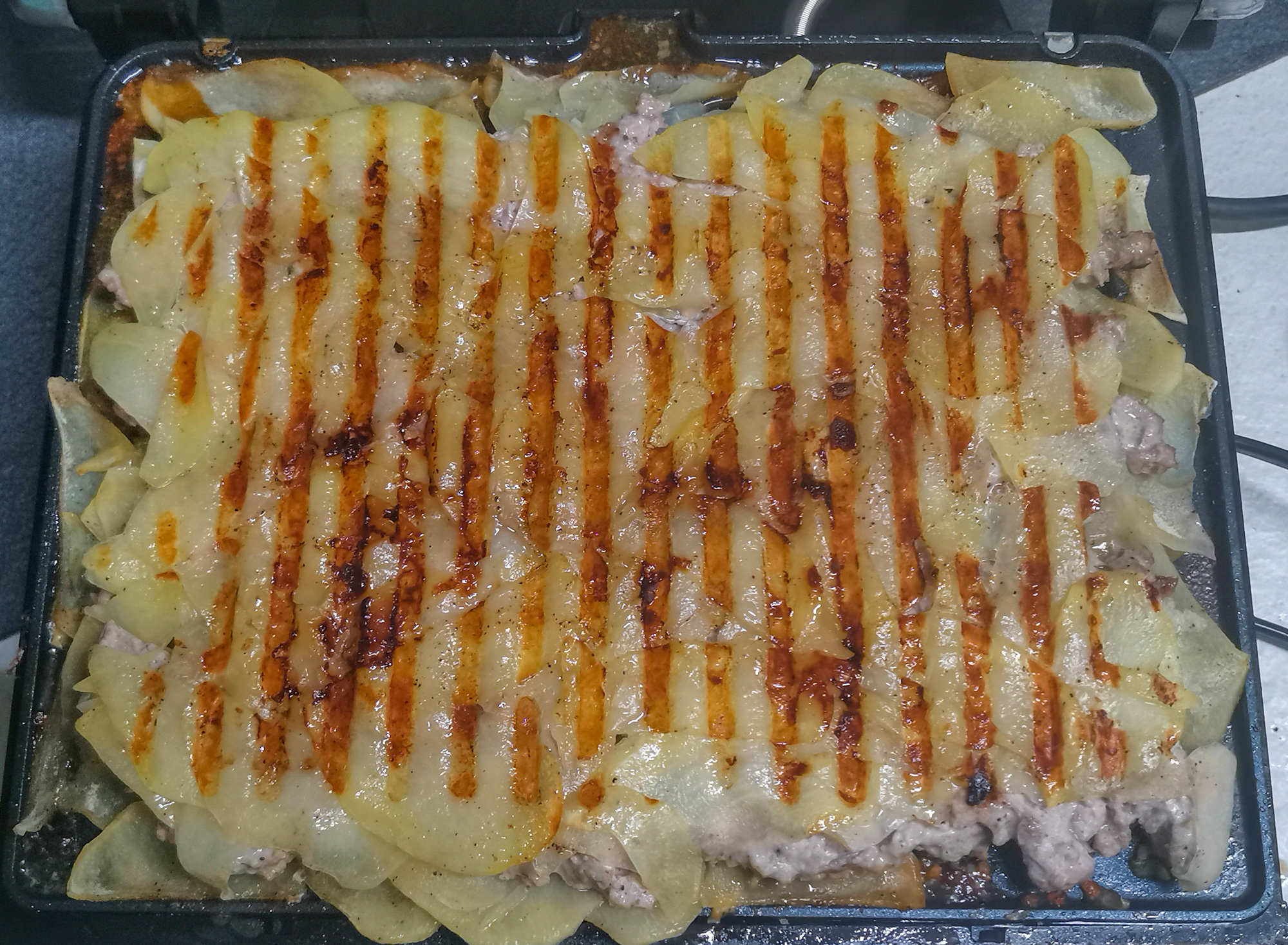 Но приготовить запеканку из нашинкованного картофеля можно и в прижимном гриле. Мы поэкспериментировали с бюджетной моделью Basic SLG6001 бренда Home Club, под которым сеть гипермаркетов Лента выпускает доступные бытовые приборы и получили вполне удовлетворивший нас результат.