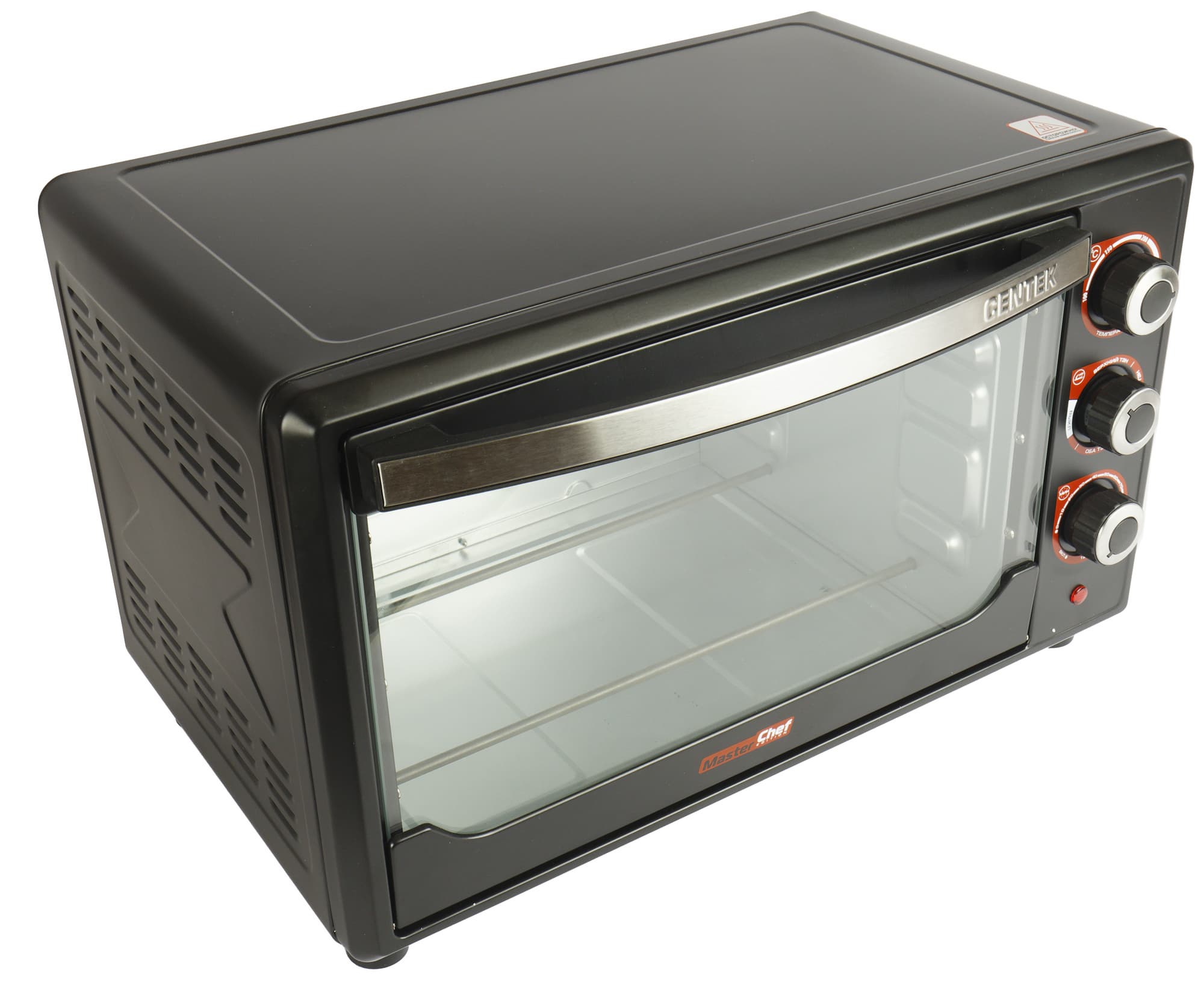Мы распаковали шкаф, установили на место, на расстоянии не менее 10 сантиметров от стены и других приборов. Жарочный шкаф, как любое универсальное тепловое оборудование, сильно нагревается в процессе работы, об этом не стоит забывать. Дно у Centek CT-1530-36 Black нагревается тоже, но за счет ножек перегрева столешницы не происходит. Стекло дверцы, разумеется, ощутимо нагревается, а вот ручка всегда остается прохладной.