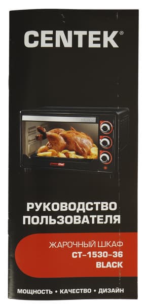 Руководство пользователя у Centek CT-1530-36 Black — небольшая брошюра в цветах печи на глянцевой бумаге. Очень лаконичный и четкий текст открывают слова благодарности покупателю и меры безопасности, понятные и стандартные для жарочных приборов.