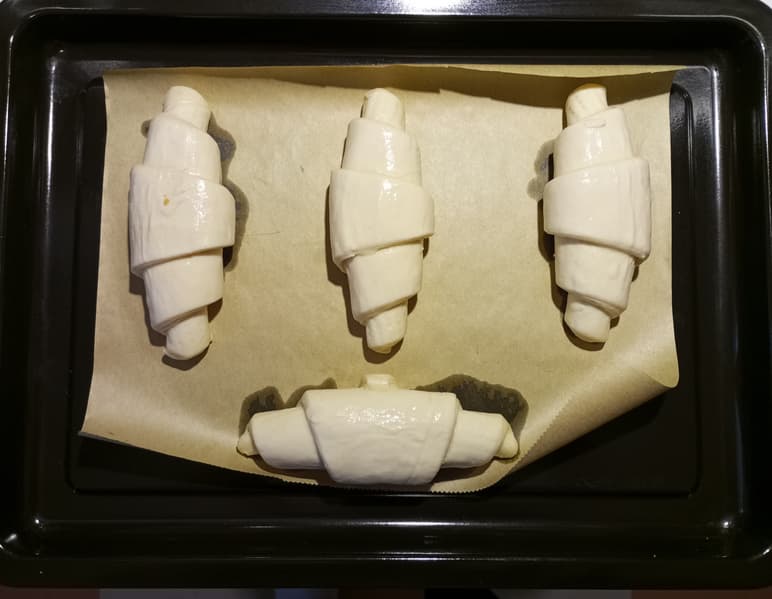 Слоеная выпечка — быстрый и всегда превосходный выбор, который требует определенной деликатности от духовки. Заготовки из замороженного теста мы первоначально немного разморозили: расположили на противне, который предварительно застелили бумагой для выпекания. Чтобы они не заветрились, их лучше на время разморозки накрыть салфеткой. Тем временем шкаф прогреваем до 180 °C, устанавливаем противень внутрь и заводим таймер на 15 минут. Через 8 минут круассаны окончательно расправились, мы понизили температуру до 150 °C, а после сигнала таймера оставили в шкафу еще на 5 минут. Важно понимать, что результат зависит не только от духовки и опытности повара, но и от качества заготовки, у разных брендов разные требования к температуре, времени и режиму выпекания.