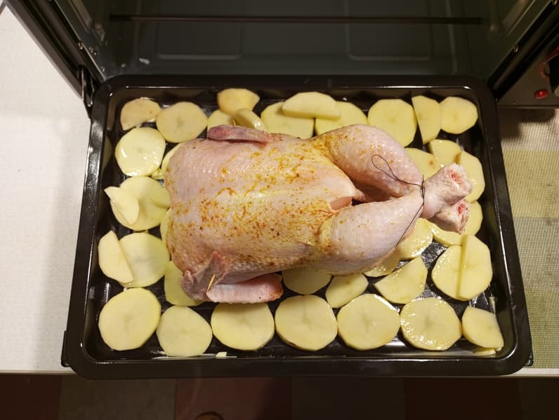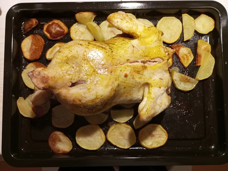Мы решили повторить рецепт, вынесенный на упаковку прибора. Взяли тушку цыпленка 1,5 кг, вымыли и немного подсушили. Нарезали картофель на круглые дольки, выложили на смазанный противень. Курицу обмазали приправами, подсолили, внутрь заложили немного чеснока и кинзы. Ножки связали, крылья прикололи к туше зубочистками. После слегка подсолили картофель, а противень установили в шкаф при температуре 180 °C на 50 минут при комбинации «оба тэна». Через сорок пять минут запах и внешний вид блюда подсказали проверить результат, и он оказался уже превосходным. Противень мы устанавливали на нижние пазы, а для любителей более яркой корочки его лучше поднять чуть выше. Мясо оказалось нежнейшим, картошка — подрумяненной и мягкой внутри.