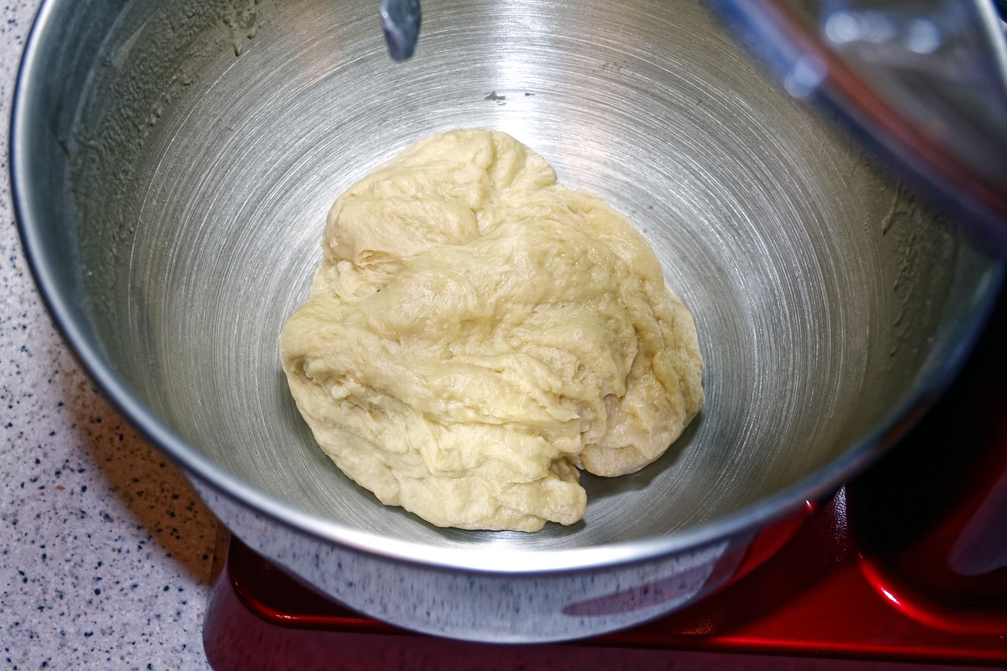 Муку, дрожжи, сахар и соль смешиваются в большой миске, затем в смесь добавляются кислое молоко, яйцо и яичный желток. Тесто вымешивается (мы вымешивали его на второй и третьей скорости на протяжении 5 минут), в процессе вымешивания постепенно добавляется масло.
