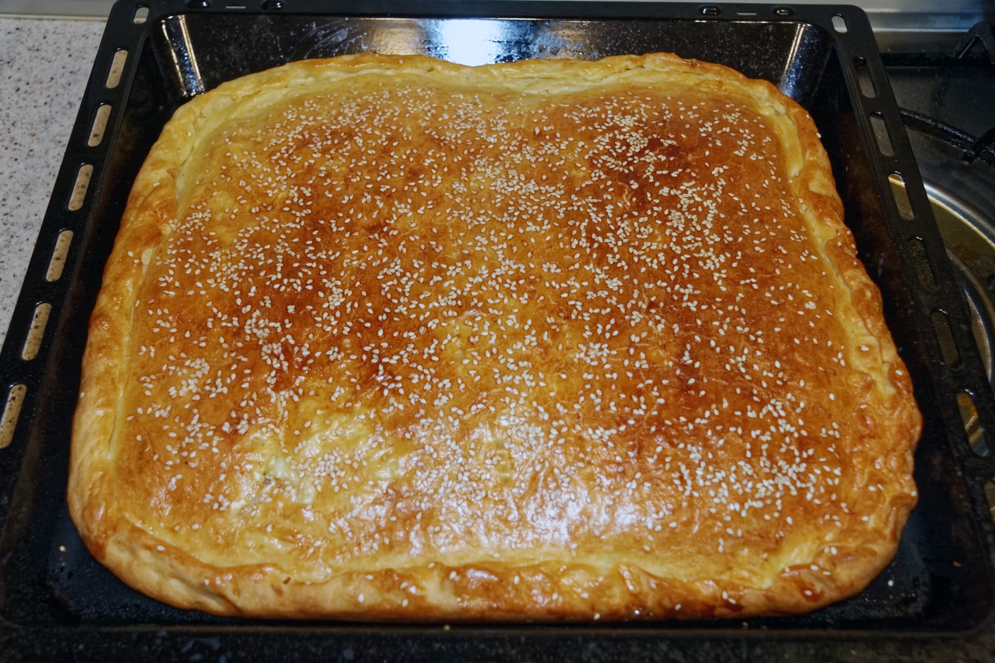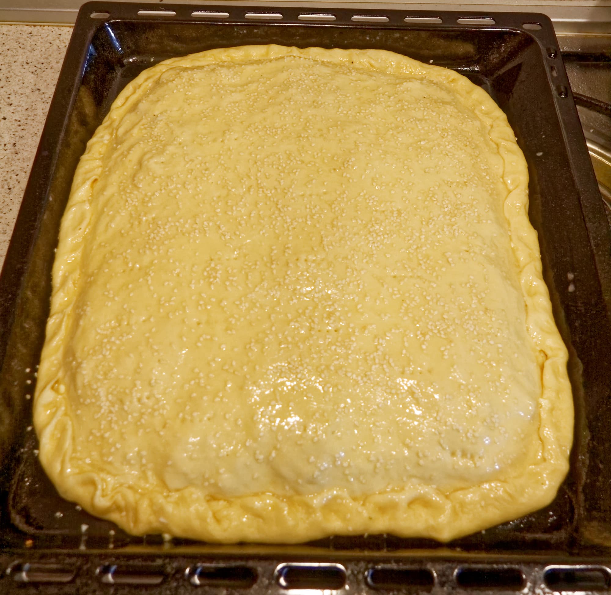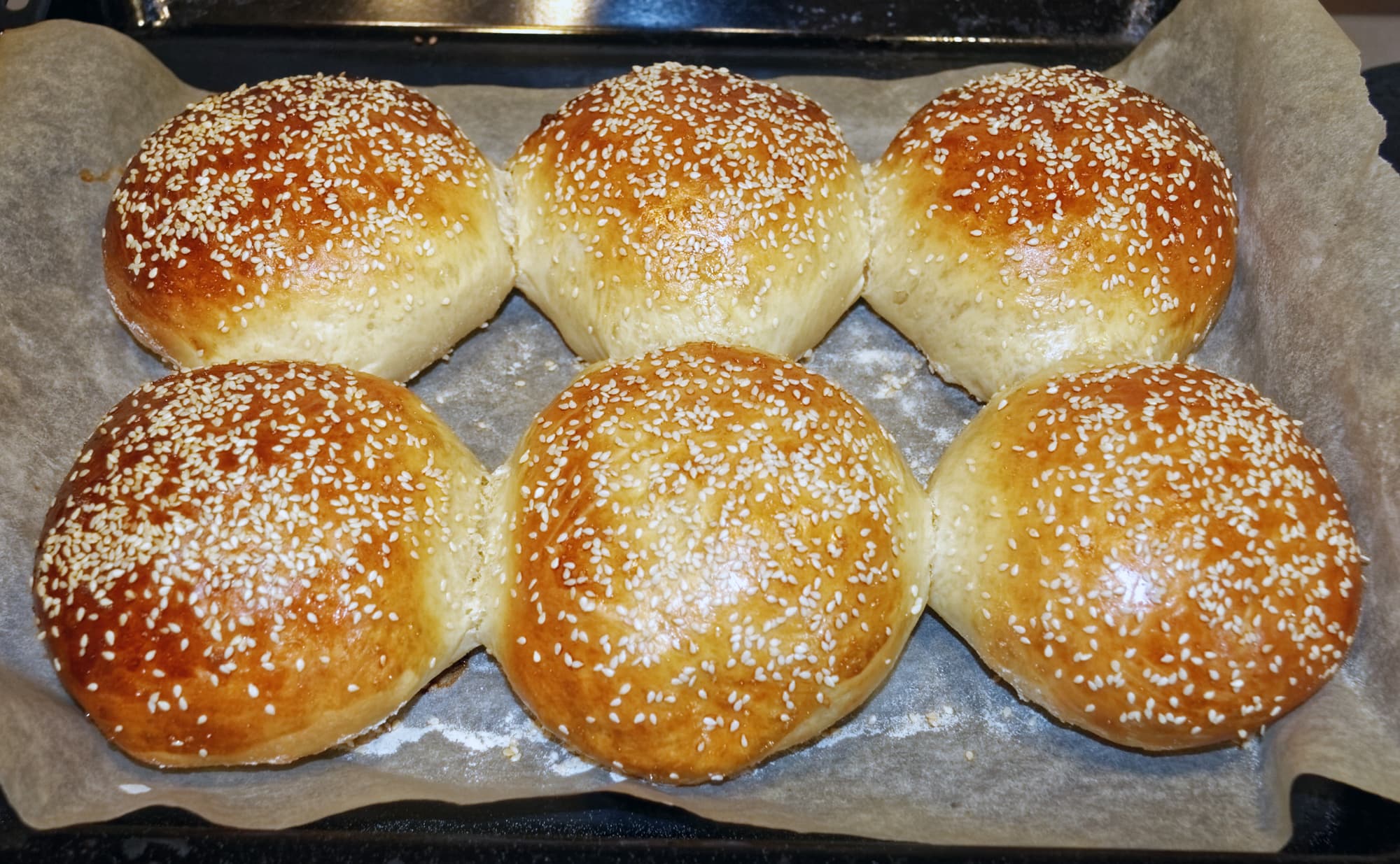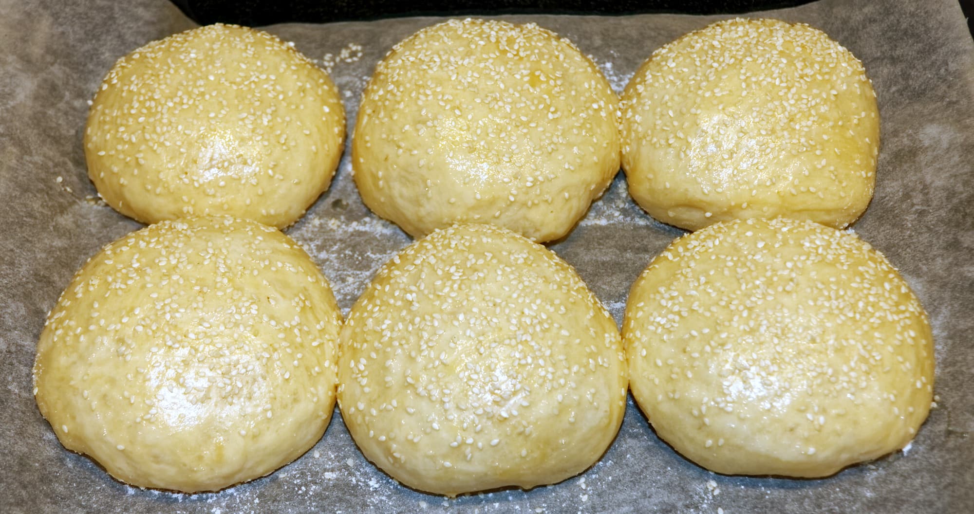 Для выпекания нужно разогреть духовку до 190 °C, смазать булочки яичным белком, взбитым с небольшим количеством воды, и посыпать их семенами кунжута.