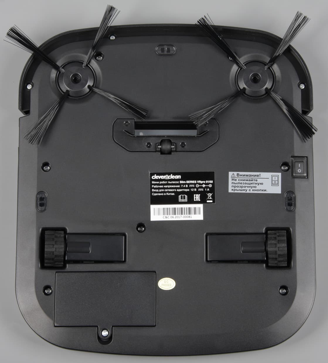Перевернув пылесос вверх днищем, мы увидим боковые щетки, всасывающую щель с резиновым скребком, передний опорный фиксированный ролик, два ведущих колеса на подпружиненных блоках мотор-редукторов, и крышку отсека аккумулятора.