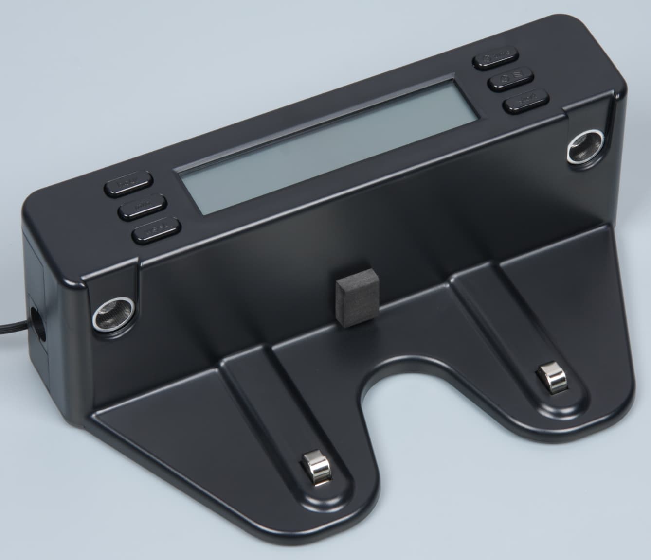На верхней панели базы расположены шесть кнопочек с едва различимыми обозначениями и относительно крупный ЖК-дисплей без подсветки. Кнопки и дисплей в основном служат для установки текущего времени и задания расписания уборки.