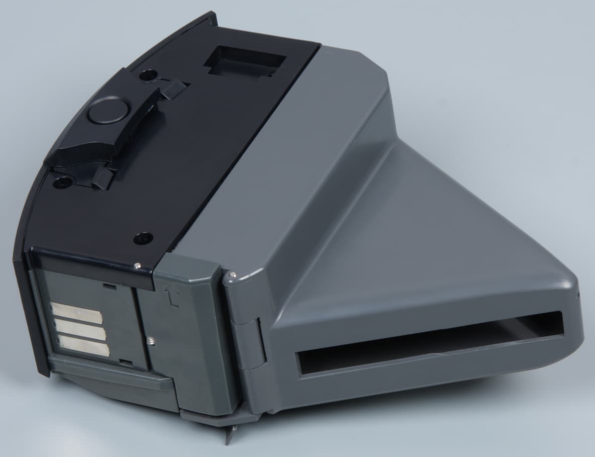 Кнопка, снимающая фиксацию пылесборника, расположена сверху. Перевернув пылесос вверх днищем, мы увидим две контактные площадки, подруливающий ролик, две боковые щетки, две основные щетки, расположенные V-образно, два ведущих колеса, всасывающую прорезь в обрамлении резиновой юбки-скребка, нишу с УФ-лампой и нижнюю «выхлопную» решетку вентилятора.