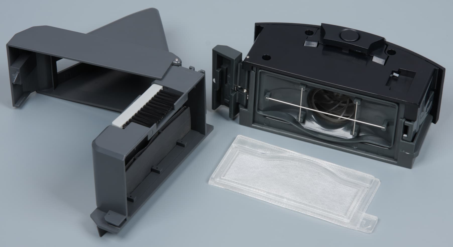 При уборке передние боковые щетки с щетинками в четырех пучках подгребают мусор к центру. У этих щеток есть упругие поводки, и щетина у них не очень длинная, поэтому они не должны быстро разлохмачиваться или ломаться. Основных щеток две, они одинаковые и расположены V-образно. Их задача состоит в том, чтобы забрасывать крупный мусор в первый отсек пылесборника. Попутно они вычесывают мелкий и легкий мусор из труднодоступных мест, что повышает эффективность следующего этапа, на котором мусор засасывается через щель между двумя резиновыми скребками, перемещается во второй отсек пылесборника, где задерживается сменным воздушным фильтром. Можно считать, что данное устройство является пылесосом в классическом смысле, так как оно какую-то часть пыли засасывает непосредственно с очищаемой поверхности. На финишном этапе убираемая поверхность дезинфицируется (хотя бы в какой-то степени) с помощью УФ-лампы (если она включена). Пылесборник выполнен из непрозрачного пластика, поэтому оценить его наполнение можно только после извлечения. Отсоединять пылесборник от пылесоса относительно удобно и после некоторой тренировки это можно делать одной рукой, не сдвигая припаркованный на базе пылесос.
