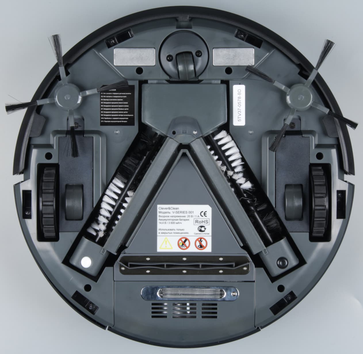 В целом компоновку робота-пылесоса Clever&Clean V-Series 001 можно назвать «классической», но его отличает наличие двух одинаковых щеток, расположенных V-образно. Способствует ли такая конфигурация щеток повышению качества уборки, достоверно определить не представляется возможным, так как нет (по крайней мере, у нас) точно такого же робота, но с обычной щеткой, ориентированной перпендикулярно направлению движения. В любом случае, на некоторую долю оригинальности этот агрегат претендовать может.