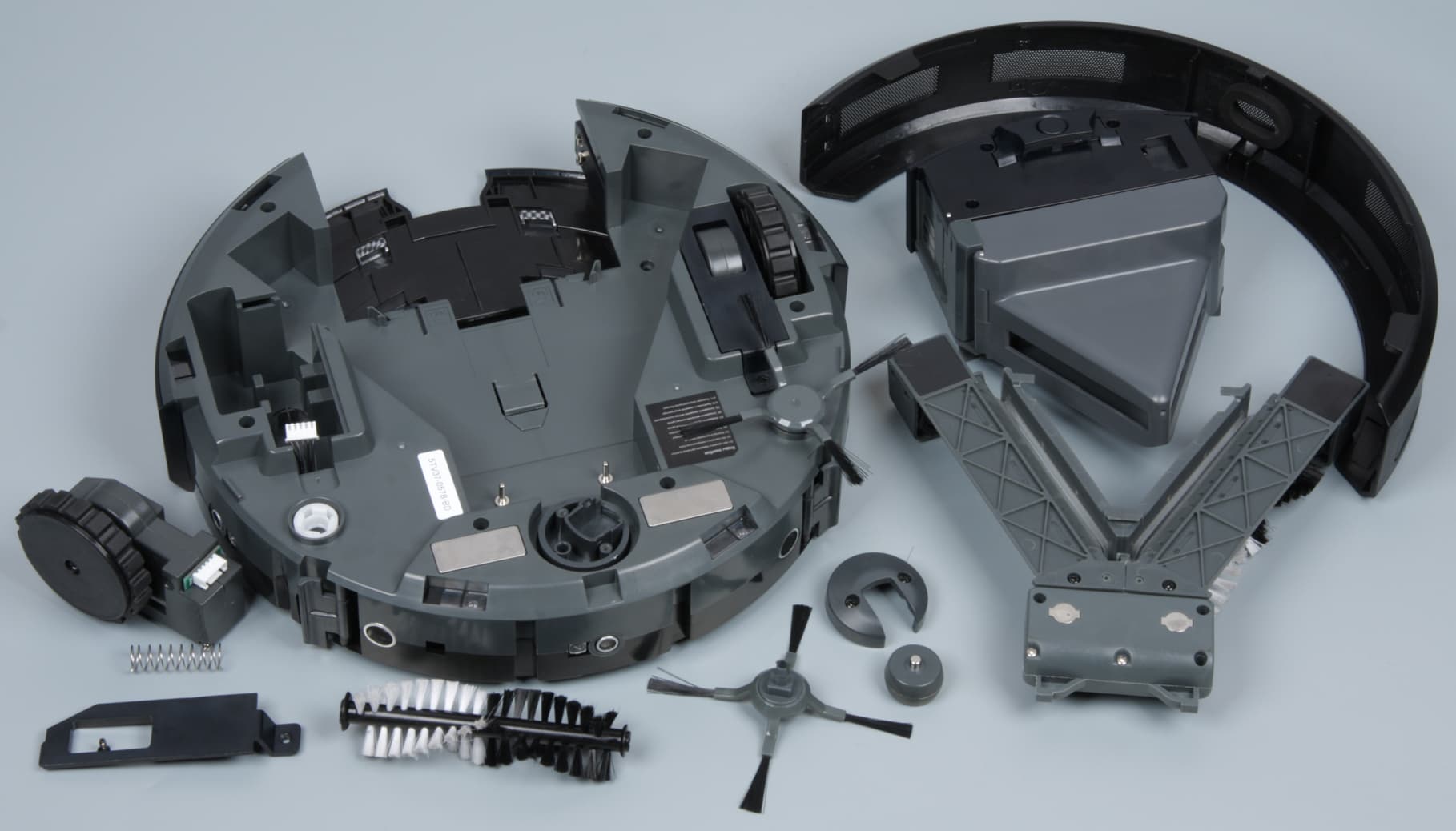 Заменить батарею и другие части может сам пользователь, вооружившись только крестовой отверткой среднего размера. При этом снять боковые щеточки, вытащить батарею и отсоединить блок с основными щетками можно вообще без инструментов. Дальнейшая разборка также относительно простая. Например, чтобы снять колесо с приводом достаточно отвернуть один саморез.