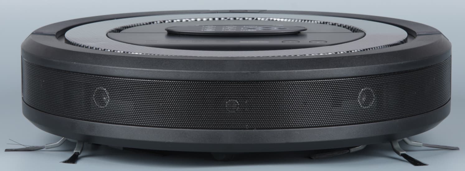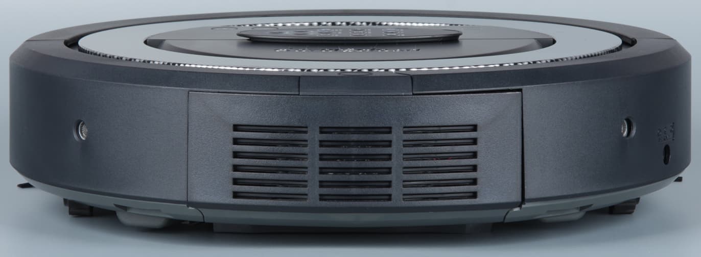 Черный вариант смотрится лучше, но на полу (и под предметами мебели) белый робот обычно заметнее, что имеет свои преимущества. Сверху ближе к передней части в корпусе есть ниша с заходом под кольцевую накладку. Эта ниша образует ручку, за которую пылесос удобно переносить. В центральной части верхней панели присутствует неглубокая выемка овальной формы, в которую вкладывается пульт ДУ. Благодаря магнитным фиксаторам пульт из ниши не выпадает, например, при переноске робота.