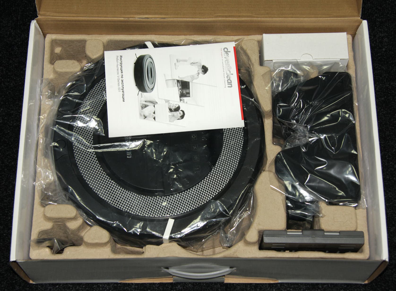 Есть и напечатанная инструкция на русском языке. Упакован пылесос в не очень большую коробку с пластиковой ручкой и отсеками, сформированными из экологически безопасного картона.