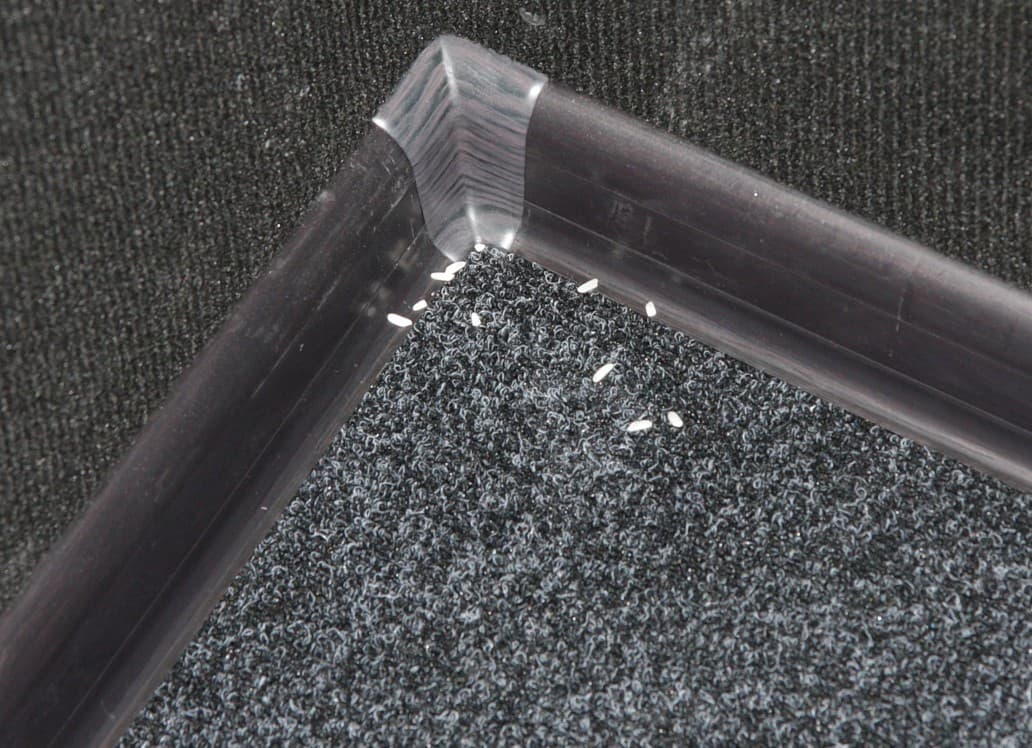 В углах, куда не дотягиваются даже боковые щеточки: