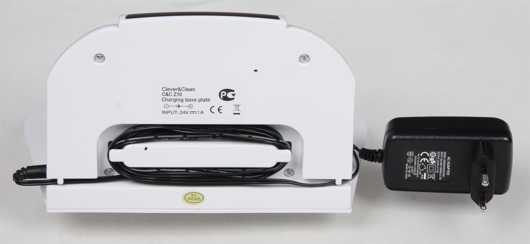 Снизу на днище базы приклеены три резиновые ребристые площадки. Преимуществ от использования внешнего БП как минимум два: во-первых, в случае выхода из строя менять/ремонтировать можно только БП, а не базу целиком, и, во-вторых, пылесос можно подзаряжать напрямую от БП, для чего на корпусе пылесоса предусмотрен разъем питания. Недостаток как минимум один — база легче, что повышает вероятность ее смещения. Сзади на корпусе базы есть углубление и пазы для намотки избытка кабеля питания.