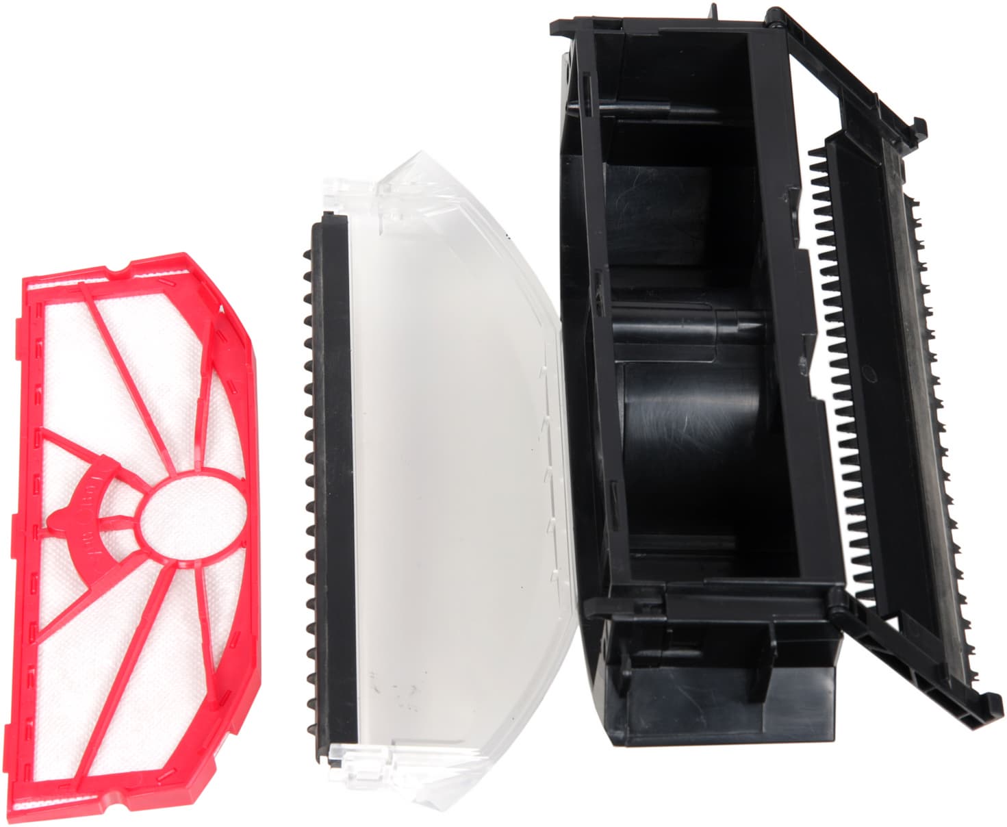 Воздушный вентилятор встроен в пылесборник, но модуль с вентилятором легко отсоединяется, поэтому сам корпус пылесборника можно мыть под водой. Отсоединять пылесборник от пылесоса относительно удобно и после некоторой тренировки это можно делать одной рукой, не сдвигая припаркованный на базе пылесос. Выдувается воздух через решетку на задней стенке вентиляторного модуля.