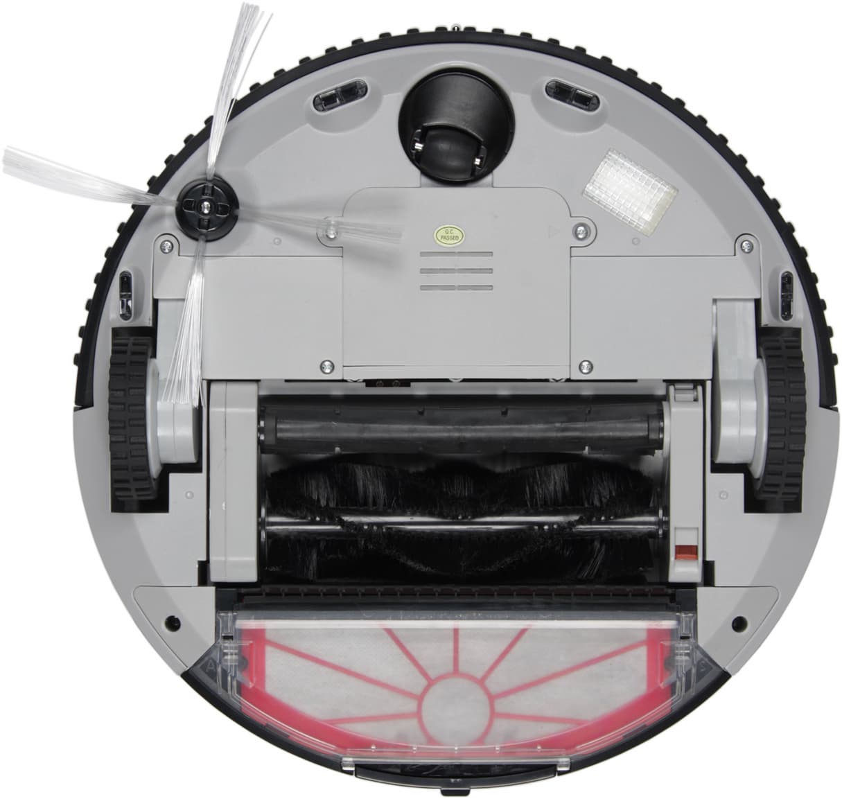 Перевернув пылесос вверх днищем, мы видим подруливающий ролик, боковую щетку, рассеиватель УФ-лампы, крышку отсека аккумулятора, два ведущих колеса на подпружиненных рычагах, отсек с основными щетками и прозрачное днище отсоединяемого пылесборника.