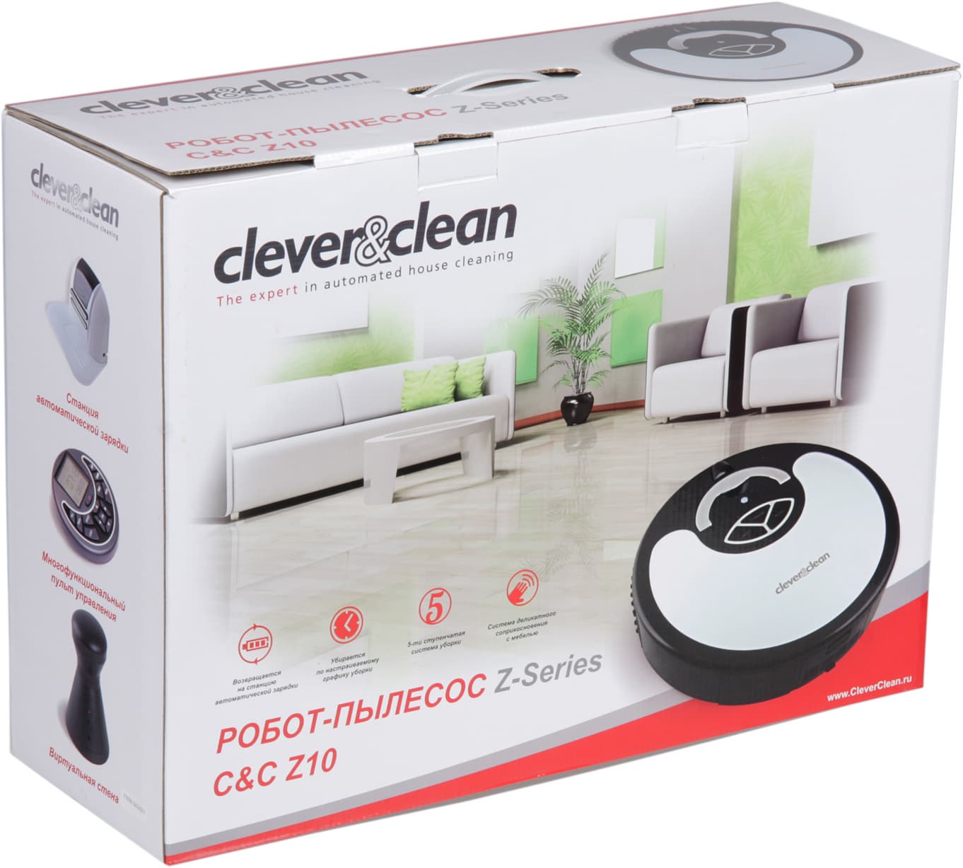Робот-пылесос Clever&Clean Z10 отличается высоким качеством уборки и за счет использования бесконтактных датчиков препятствий и резинового бампера с мягкими пупырышками он очень бережно относится к мебели, так как держится от нее на расстоянии, а если и толкнет ножку стула, то повреждений на ней точно не оставит. Тогда как, например, многие пользователи пылесосов iRobot Roomba, во избежание порчи мебели с легко повреждаемой поверхностью, вынуждены наклеивать на бампер мягкие резиновые полоски. Побочными следствием приоритета ИК-датчиков у Z10 является то, что любая занавеска и т. д., свисающая до пола, будет непреодолимым препятствием, а от светлых стен робот отступает чуть дальше, чем от темных, в результате вдоль первых может оставаться немного мусора. Особо отметим хорошую комплектацию, включающую виртуальную стену, сменные декоративные накладки, запасные расходные части и материалы, а также очень удобный в использовании радиочастотный пульт ДУ.