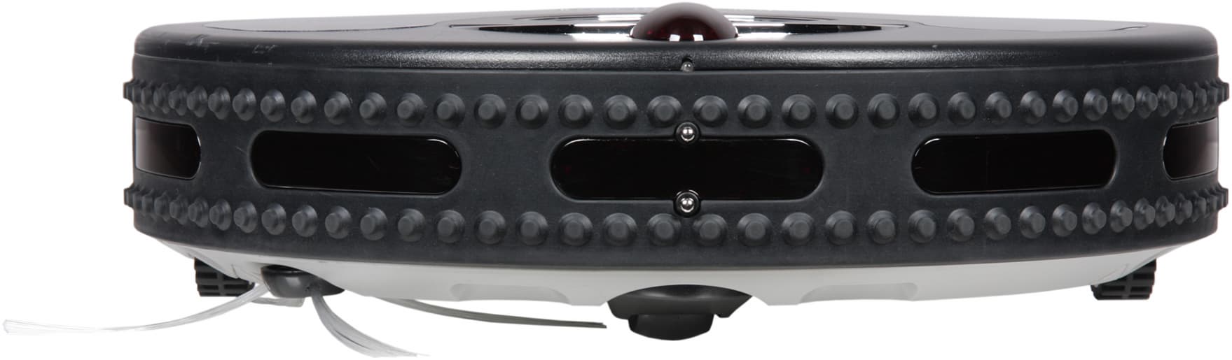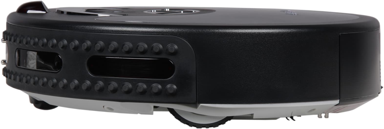 За окошками находятся излучатели и приемники ИК-излучения, исполняющие роль датчиков приближения. Пупырышки смягчают удар о препятствие (которое не обнаружили ИК-датчики), а также работают в качестве контактных датчиков столкновения. Точно по центру спереди расположены подпружиненные контакты, обеспечивающие зарядку на базе. Выше — датчик парковки на базу, а еще выше, уже на верхней панели — обзорный выступающий вверх ИК-датчик, который собственно и определяет минимальную высоту просвета предметов обстановки, под которые пылесос еще может забраться. На левом боку ничего интересного. На правом, ближе к задней части находятся разъем питания для зарядки минуя базу, и клавиша выключения.