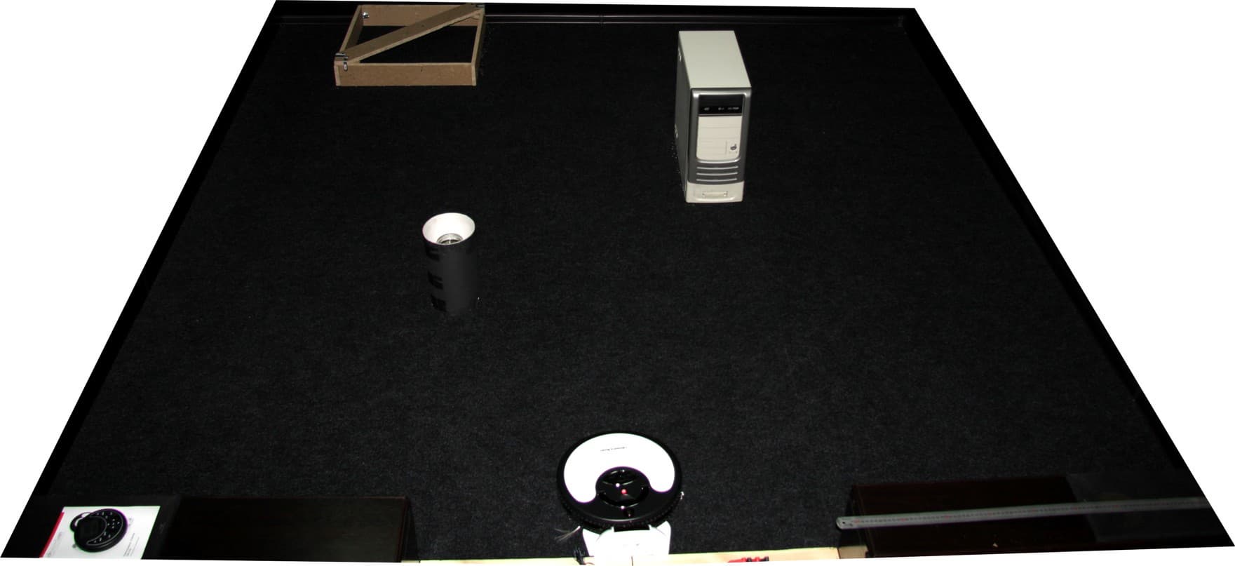 Узкий загончик (шириной на 5 см шире корпуса робота) не представлял для пылесоса особо сложной задачи — он часто в него заезжал, а, заехав, проводил в нем не очень много времени. Датчиков глобальной ориентации у робота нет, поэтому он не строит карту, не отслеживает убранные/неубранные участки и не знает своего текущего положения относительно базовой станции, стен и других препятствий. Заметим, что используемый модельный мусор продемонстрировал недостатки (особенности) пылесборника: часть риса пылесос просто сгребает резиновыми скребками и перемещает по ходу движения, также часть риса высыпается из нижнего отсека пылесборника после выключения вентилятора, создающего разрежение. Это хорошо видно в третьей части первого видеоролика — место окончания цикла уборки отмечено небольшой кучкой риса. Тем не менее, за 20-30 минут достигалось высокое качество уборки, в том числе в углах, около базы, вокруг препятствий и вдоль темных стен: