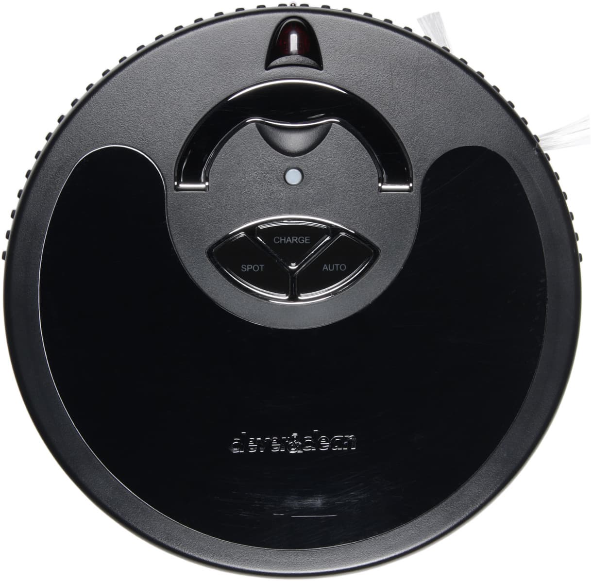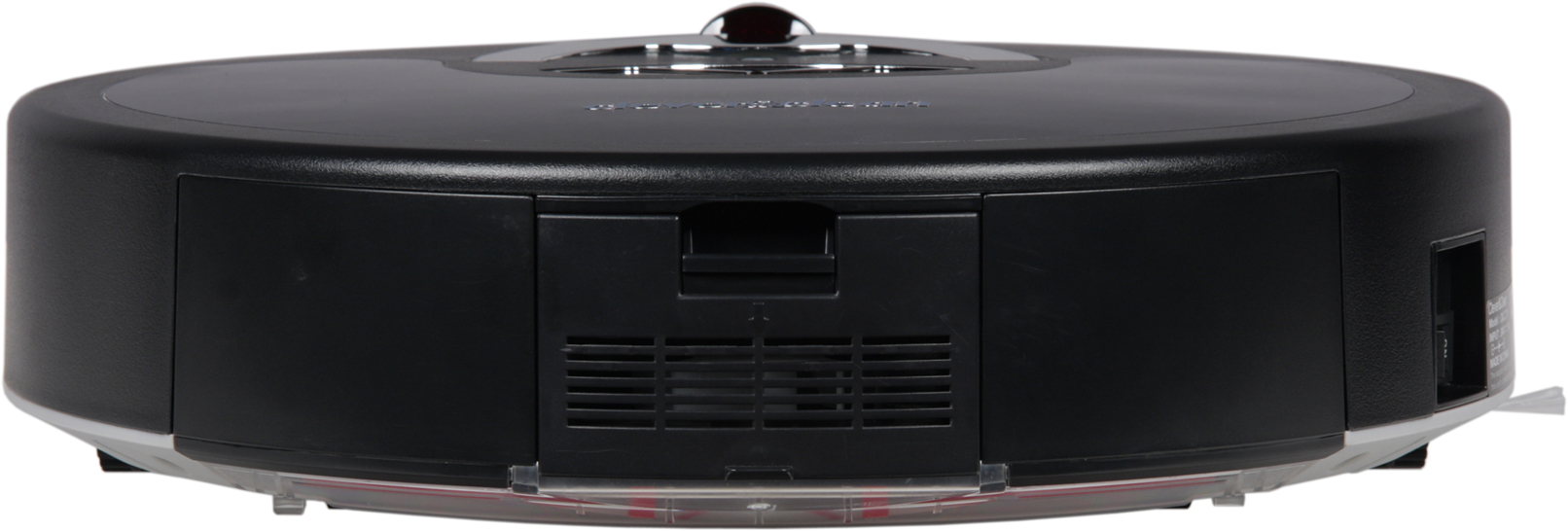 Скос снизу поможет преодолевать препятствия, а некоторая угловатость сверху снижает вероятность того, что пылесос будет застревать под препятствиями с небольшим просветом. Корпус пластиковый с матовой поверхностью: сверху и с боков черный, а днище — светло-серое. Разнообразие во внешний вид вносят сменные накладки сверху из тонкого пластика. В комплект поставки входят три таких накладки разного цвета, а белая наклеена изначально. В ходе тестирования, чтобы улучшить качество видеосъемки с автоматической экспозицией, мы поверх белой наклеили черную накладку. Возможно, предыдущую можно было отклеить, но мы этого делать не стали, поэтому на фотографиях (сделанных после тестов) можно разглядеть каемку от белой накладки. Отметим, что корпус на наших фотографиях местами в царапинах — это следствие полевых испытаний, пылесос из коробки повреждений не имеет. Сверху есть небольшая дугообразная ручка из пластика с хромированной поверхностью, приподнимающаяся на пару сантиметров, за которую пылесос удобно переносить. В центральной части верхней панели располагаются три механические кнопки с подсвечивающимися синим цветом надписями, а перед ними — матовый кружок индикатора состояния с красной подсветкой. Надписи на кнопках подсвечиваются только тогда, когда робот находится в соответствующем состоянии. На протяжении почти половины окружности передней части корпуса идут два ряда резиновых пупырышков и овальные окошки из пластика темного с виду, но прозрачного для ИК-излучения.