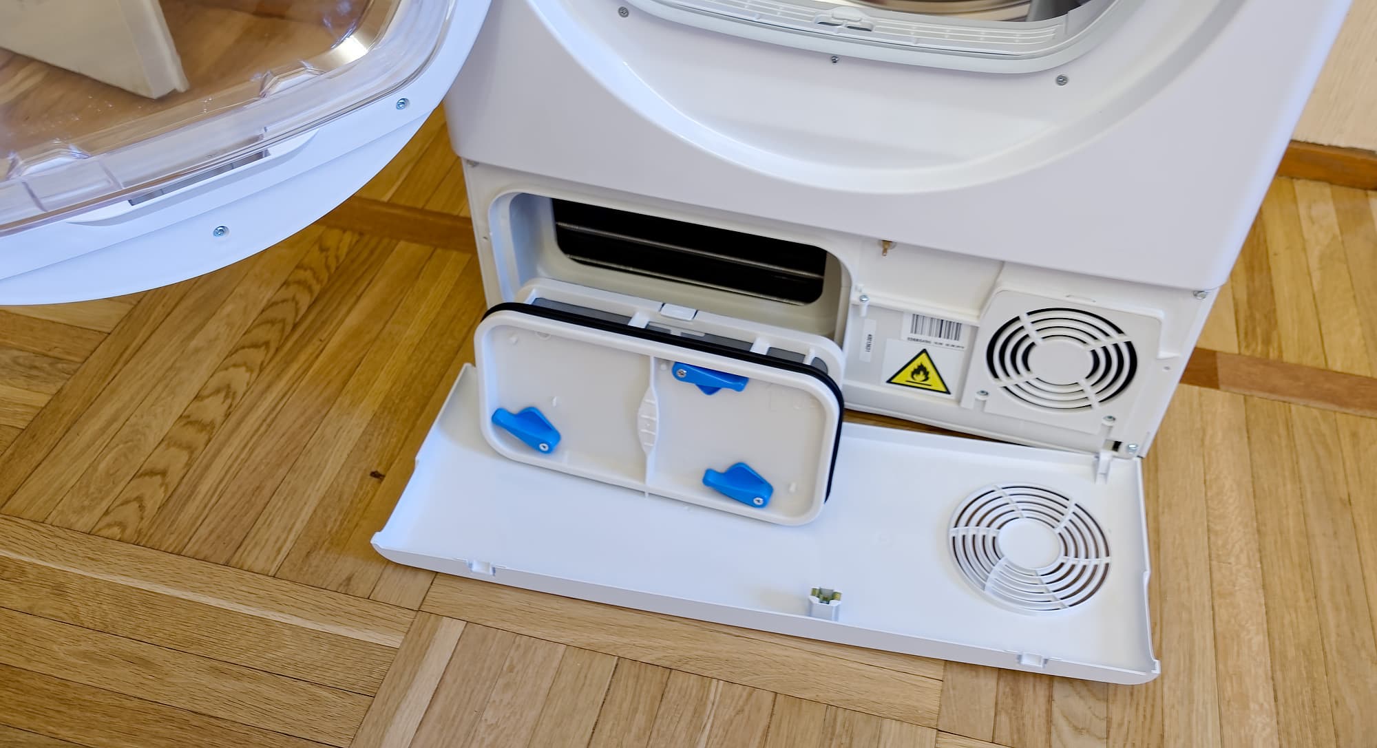 В процессе работы воздух проходит через специальные фильтры, которые необходимо время от времени очищать от частиц белья. Особой сложности эта задача, впрочем, не представляет.