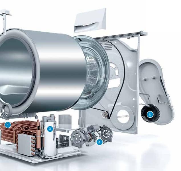 Наиболее современные сушильные машины оснащены тепловым насосом — специальным устройством для охлаждения воздуха, прошедшего через барабан с бельем. То есть, по сути, компактным холодильным аппаратом.