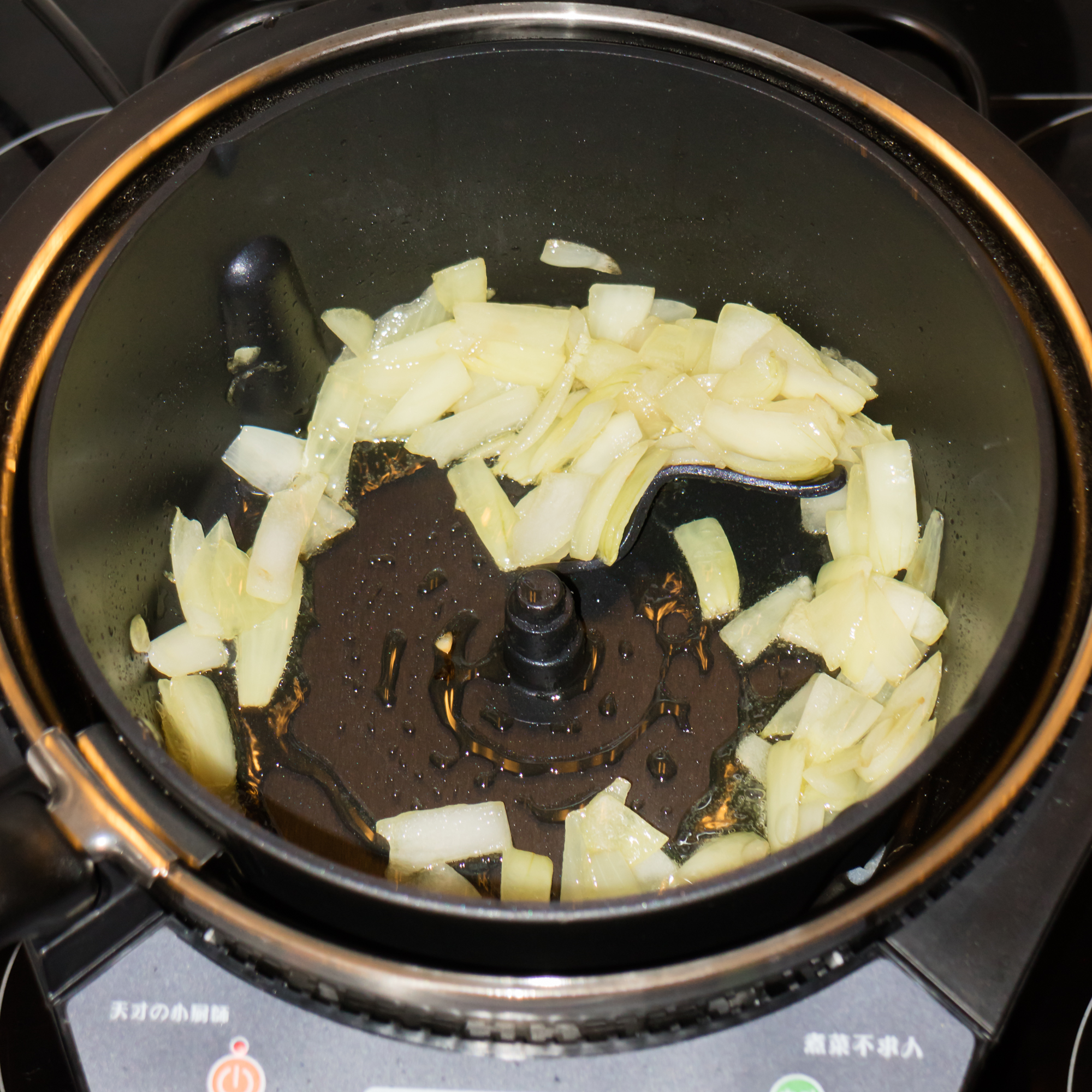 Нагрели кастрюлю с перемешивателем, добавили масло, включили программу stir-fry в первом режиме. Помня о долгой обжарке в первом опыте, сразу установили 20 минут. Лук добавили через две минуты после начала процесса — ждали, пока хорошо разогреется масло. На фотографии можно увидеть лук через 5 минут после обжаривания. Лук никак не изменил свой цвет.