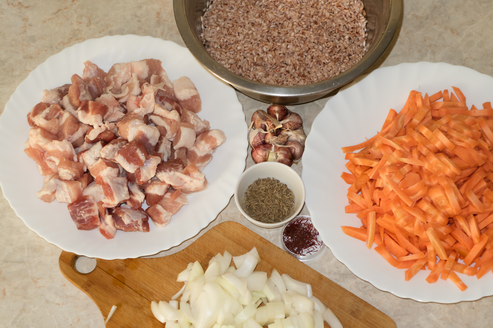 мясо (свинина) — 500 г, рис сорта девзира — 500 г, морковь — 500 г, репчатый лук, головка чеснока, соль, зира, шафран