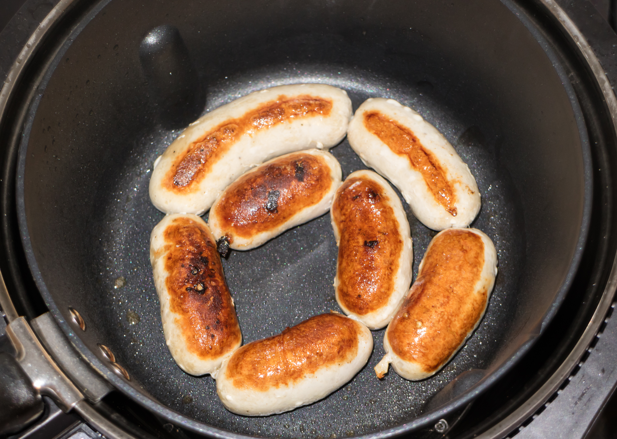Мощность режима жарки оказалась достаточной, чтобы быстро и качественно поджарить домашние свиные сардельки. Совсем необязательно было пользоваться микроволновой печью. Можно было бы просто оставить сардельки минут на пять под закрытой крышкой по завершении времени жарки. Думаем, что под действием жара от стенок и дна кастрюли мясо дошло бы до нужной степени готовности.