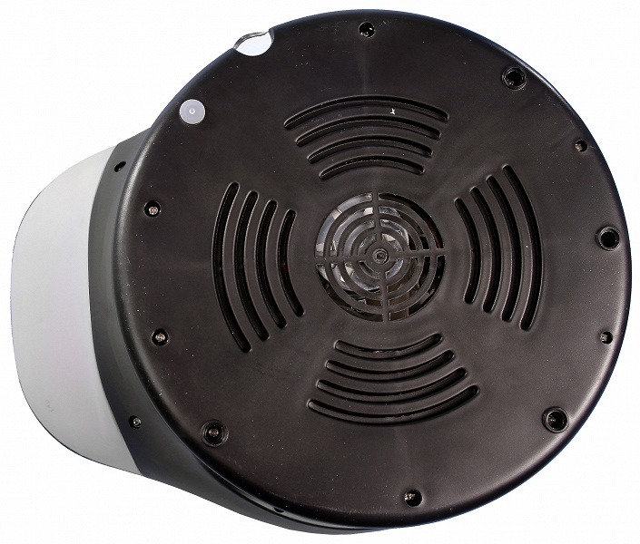 Со стороны дна размещены вентиляционные отверстия и четыре ножки с пустыми дырочками. Лишь на пятой ножке прикреплена силиконовая накладка, предназначенная, вероятно, для лучшего сцепления с поверхностью стола. Где находятся четыре остальные и были ли они изначально, мы не знаем. Тщательный осмотр упаковки не помог нам выяснить, куда же делись накладки на ножки. Несмотря на это, прибор устойчиво располагается на столе: не шатается из-за разницы в высоте ножек, а благодаря весу не сдвигается при легких толчках.
