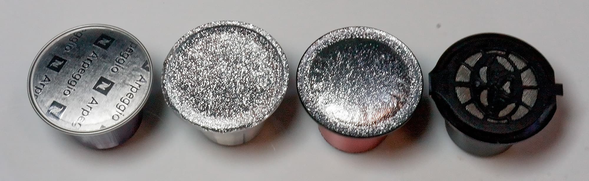 Вот так они выглядят в запечатанном виде (слева направо — Nespresso, «Живой кофе», Coffesso, многоразовая пластиковая капсула).