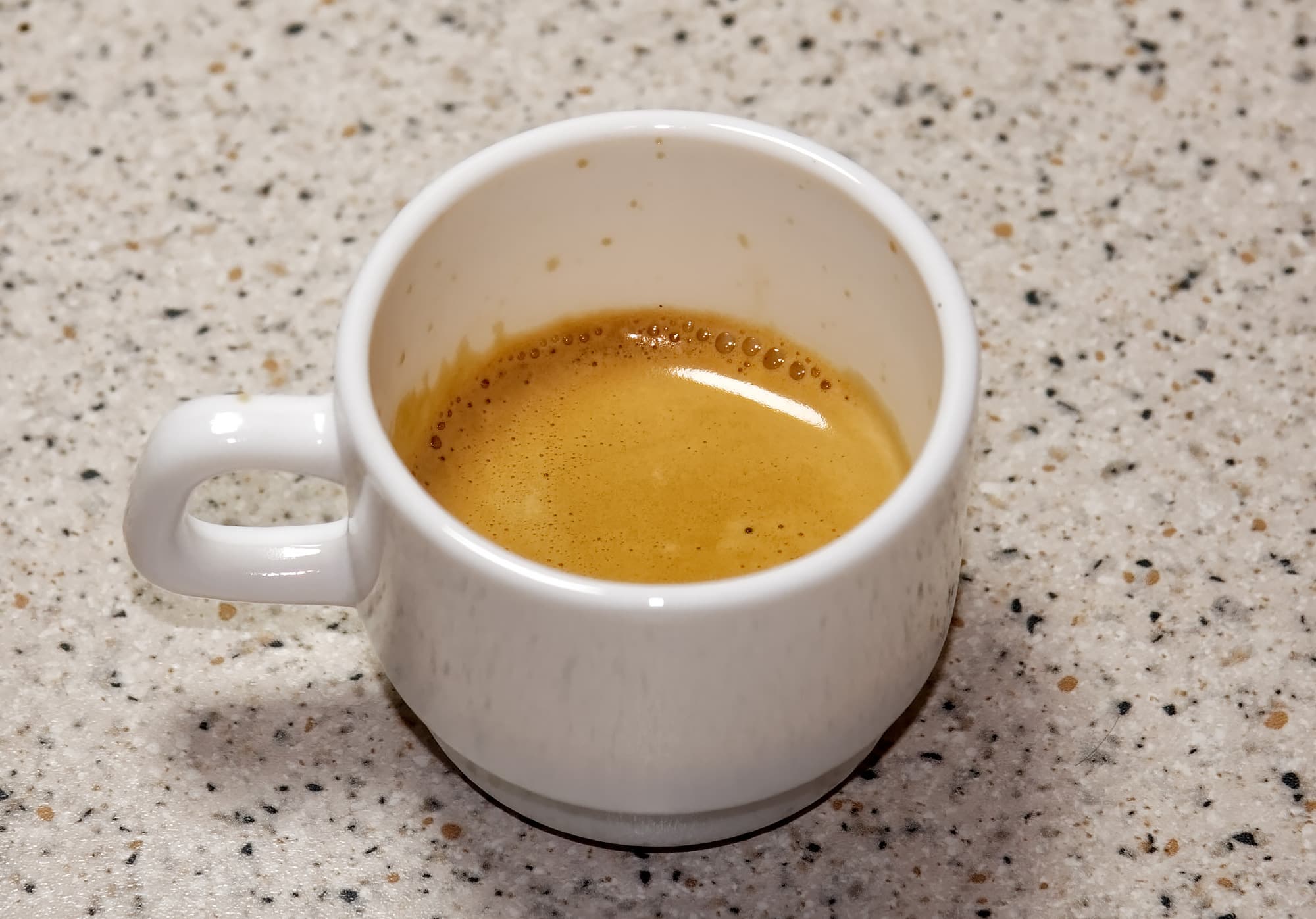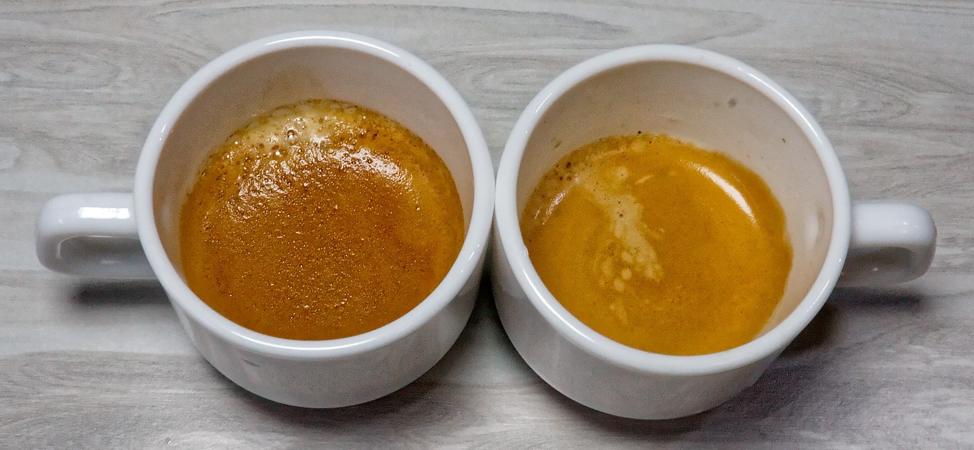 Слева — Nespresso Arpeggio (без пенки крема), справа — наш бюджетный кофе из многоразовой капсулы. Как видно, объем напитка оказался чуть меньше, но незначительно — от силы на 5-8 г (в чашке слева, напомним, 37-38 г кофе).