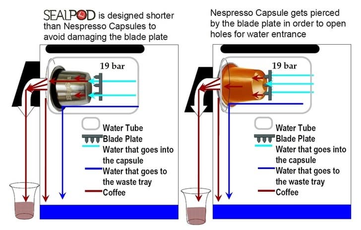 Способ прокалывания был позаимствован из медицинской сферы — капсулы было решено прокалывать специальной иглой точно так же, как резиновые крышки бутылочек с лекарствами прокалываются иглой шприца. Через эту же иглу кофеварка подавала в капсулу сначала горячий пар, а потом — воду.
