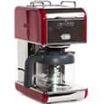 Это самая дорогая модель в нашем обзоре. Ее высокая стоимость обусловлена не количеством функций, а заявленным качеством сборки и металлическим корпусом модели. У Kenwood есть три почти одинаковых капельных кофеварки, отличающихся цветом корпуса (и последней цифрой в номере). Тестируемая нами модель, CM041, выполнена в металлическом корпусе с вишнево-красными пластиковыми вставками. Внешне кофеварка выглядит довольно внушительно. Металл и углы придают конструкции солидность, а красные вставки на корпусе зрительно выделяют прибор из всей кухонной техники. Благодаря дизайну и весу модель кажется крупнее своих истинных размеров.