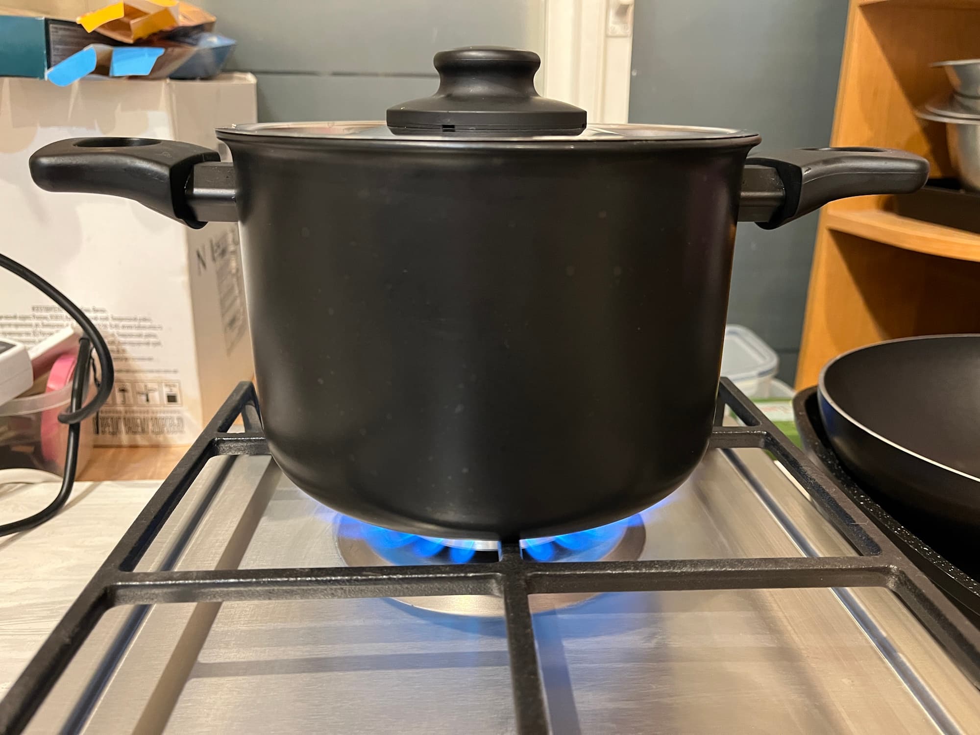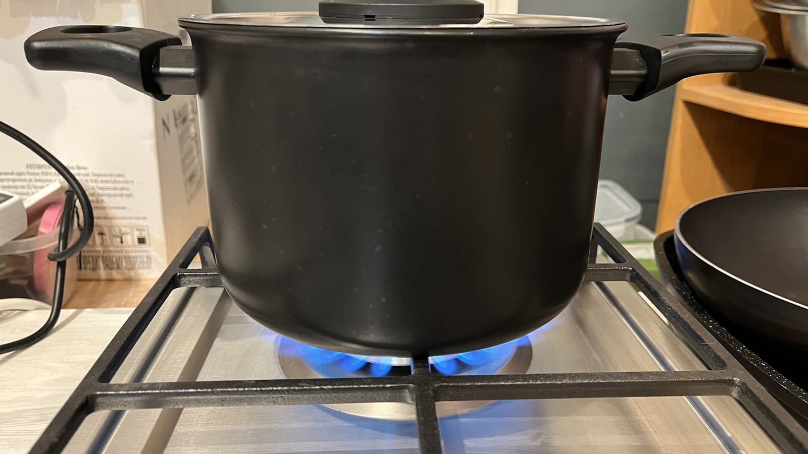 В наших тестах литр воды на большой конфорке закипел за 6 минут 10 секунд. Мы готовили фунчозу с индейкой, купаты с овощами на гриль‑сковороде и безалкогольный глинтвейн. Пламя горело ровно, газ‑контроль и электроподжиг функционировали без сбоев, пламя было стабильным.