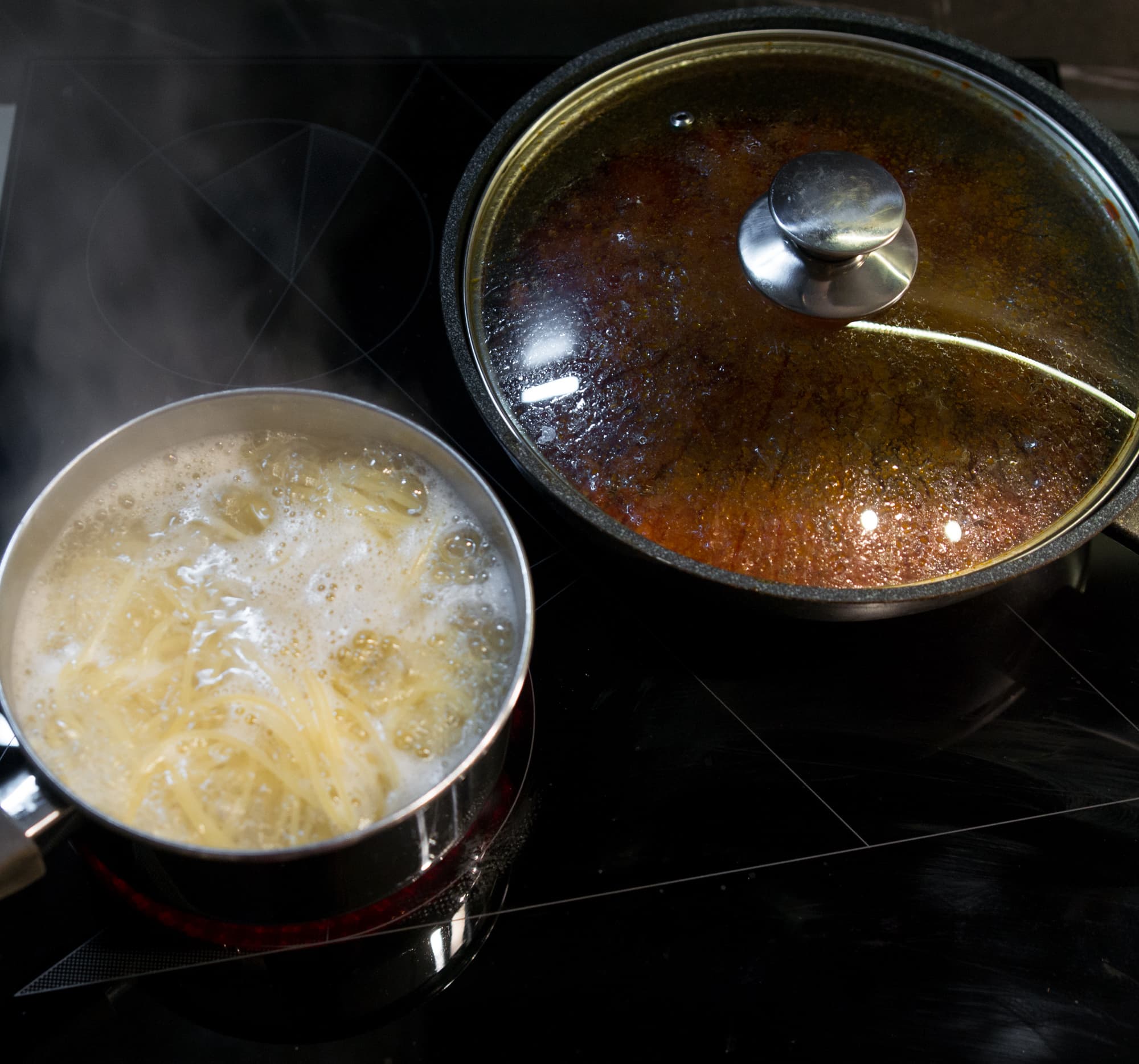В тестах варочная панель показала стабильную работу и соответствие заявленных характеристик реальным результатам измерений. 1 литр воды (на большой двухконтурной конфорке закипел за 8 минут, на дальней левой — за 9 минут 45 секунд. Фактическая мощность конфорок соответствует заявленной (1797 Вт, 1239 Вт, 1000/1987 Вт). Мы готовили говяжий бульон (стабильное поддержание температуры 88–90 °C), жареный картофель и стейк, спагетти болоньезе хрустящие баклажаны для салата — все получилось. Нагрев быстрый, остывание медленное — можно использовать остаточное тепло для экономии электроэнергии.