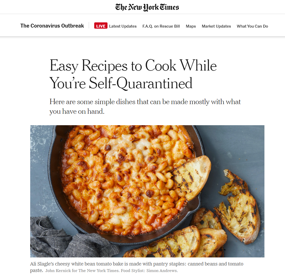 Рецепты New York Times для тех, кто находится на карантине: лапша и бутерброды, хумус и карбонара, много фасоли и печеньки, которые не нужно печь, рецепты на случай, если у вас нашлась банка консервированного тунца, и завтраки за 10 минут — отличная подборка на все случаи жизни.