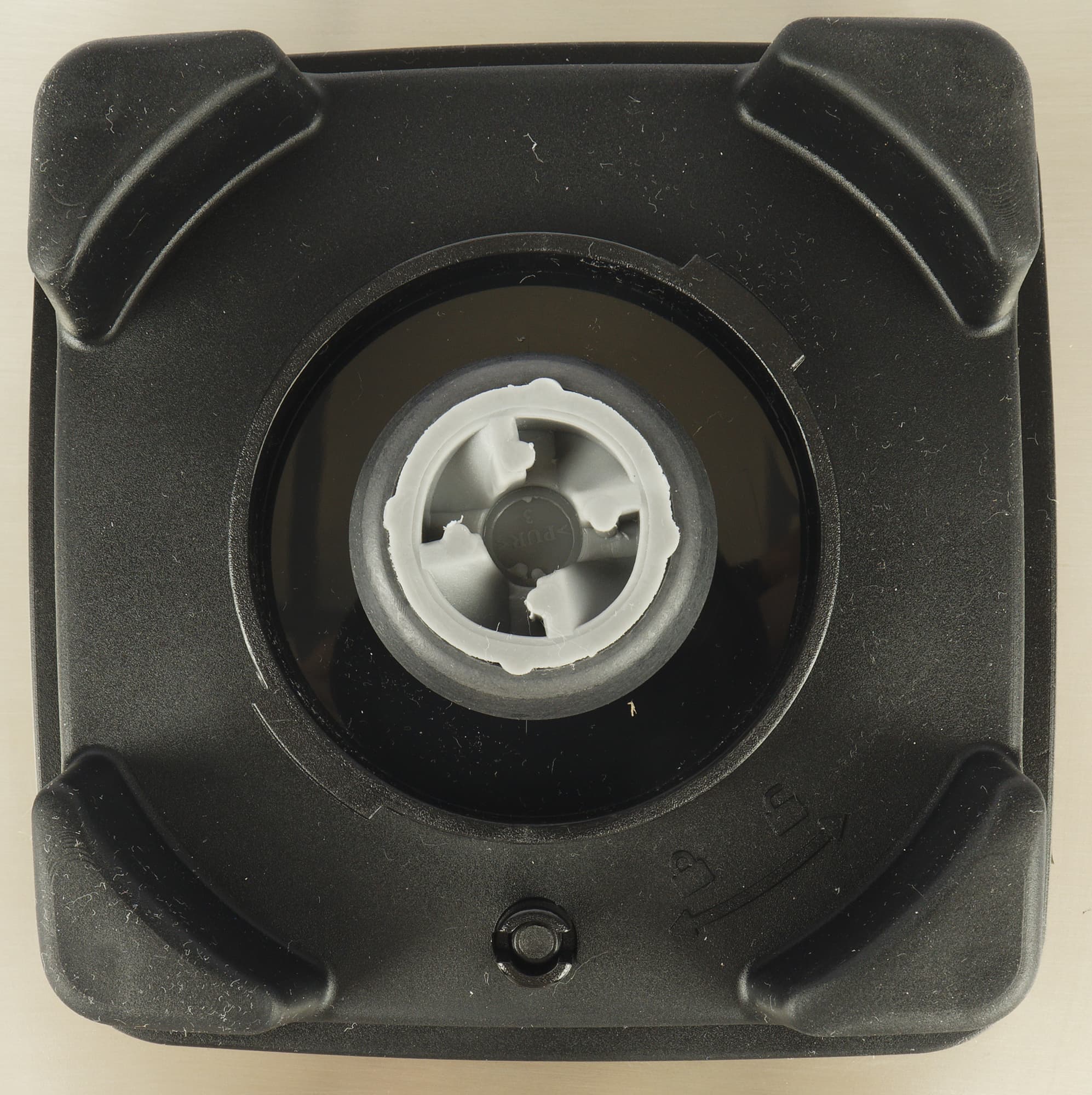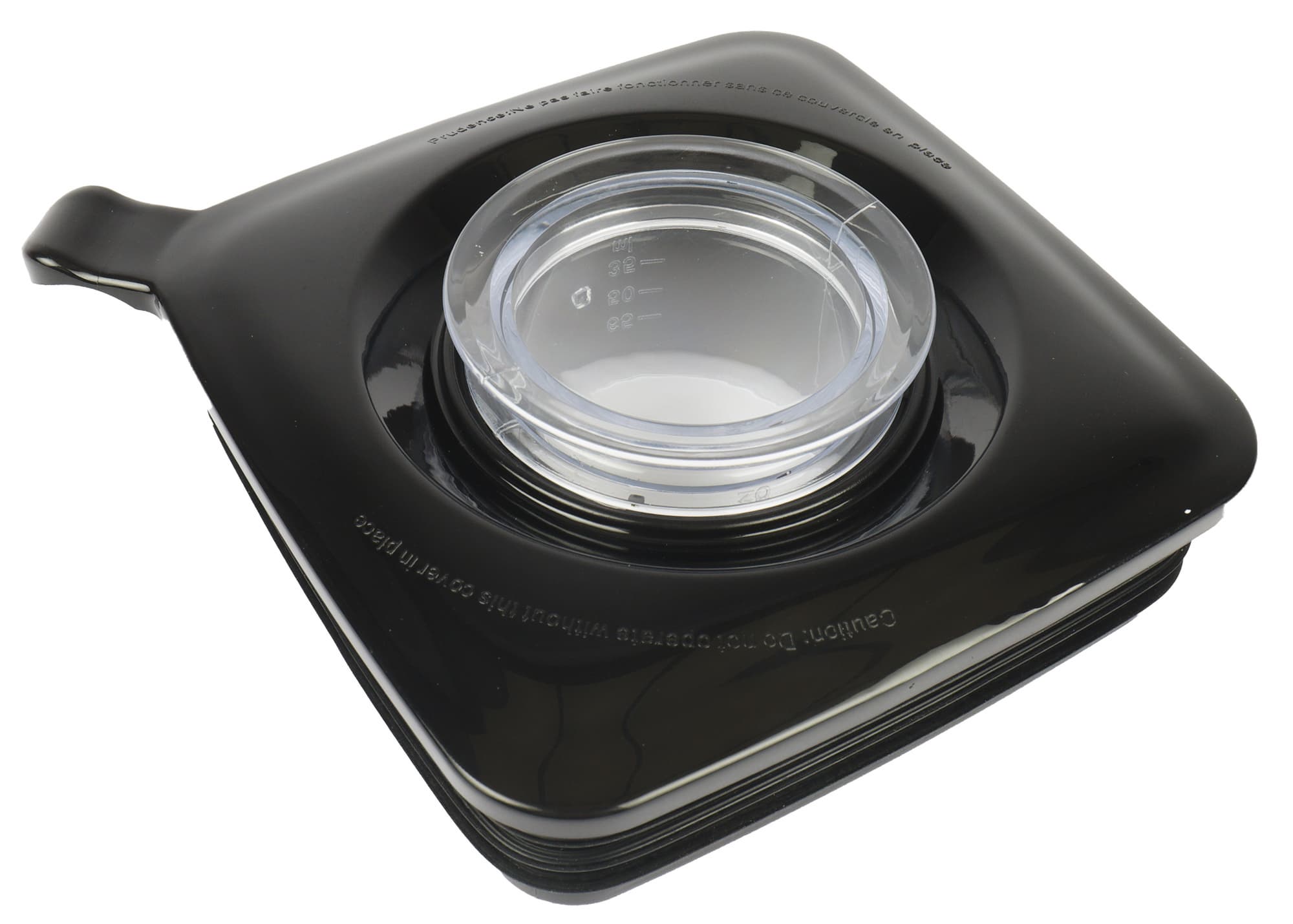 Крышка из черного глянцевого пластика с внутренней стороны имеет широкое уплотнительное кольцо из резины. Деталь вставляется в кувшин с усилием и полностью исключает вылетание брызг в процессе работы. По бокам не сильно бросающимися в глаза мелкими буквами выдавлено предостережение не использовать устройство без установленной крышки, на английском и французском языках.