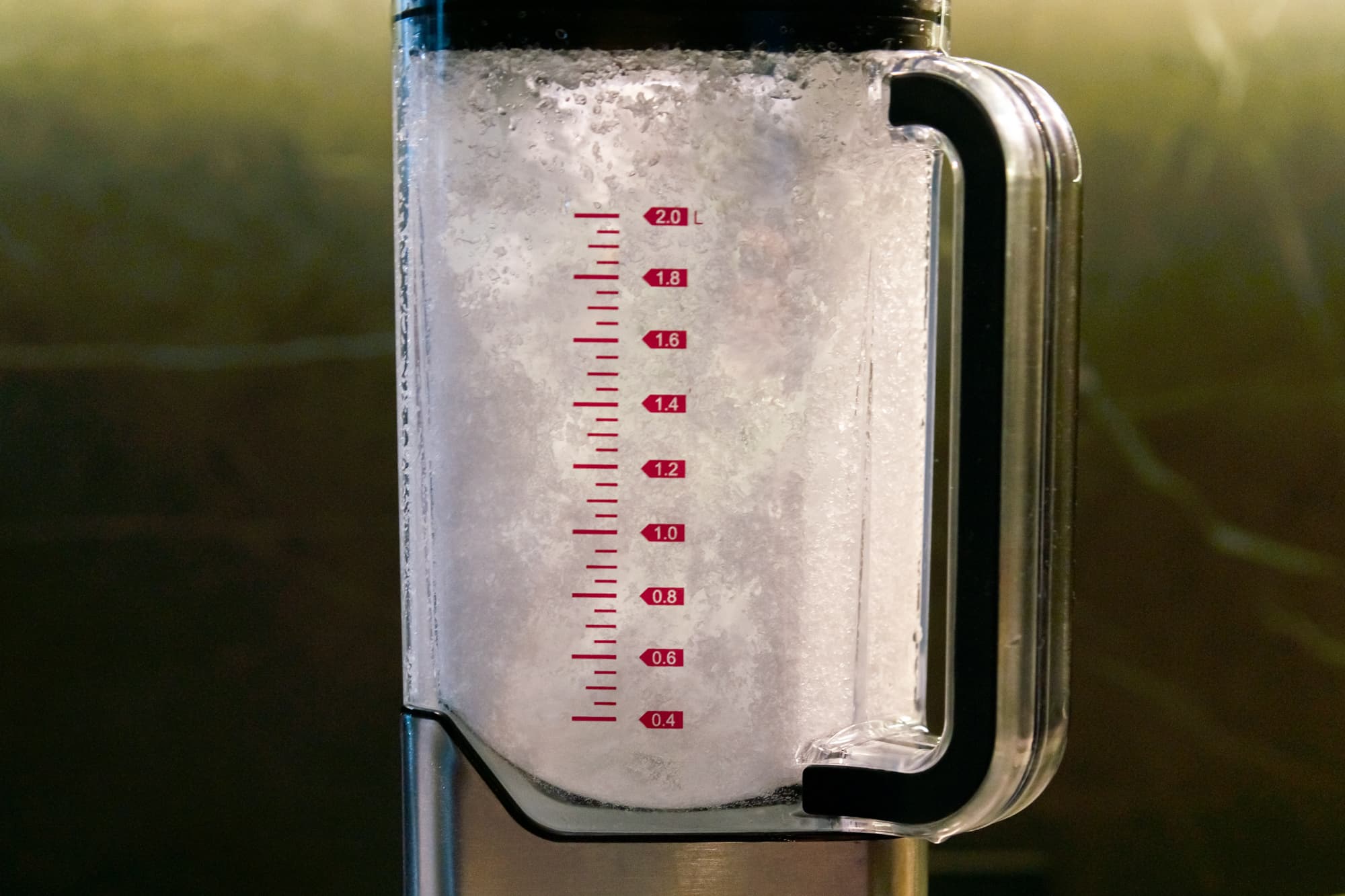 Минимальный объем до самой нижней отметки на кувшине составляет 380 мл, до верхней риски помещается ровно 2 литра. В инструкции ничего не говорится об объемах обрабатываемых ингредиентов, но логично предположить, что эти два значения и есть нижний и верхний пороги.