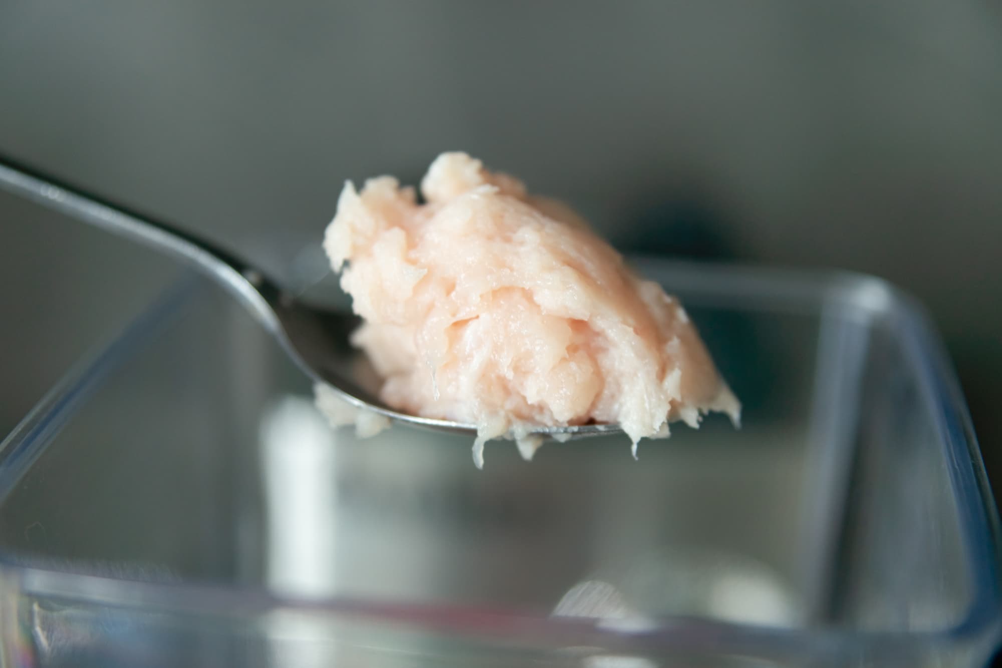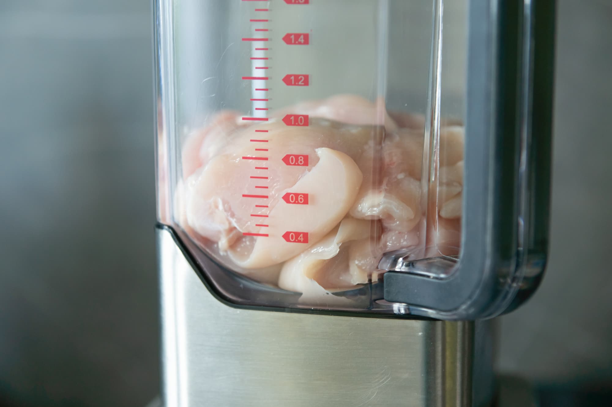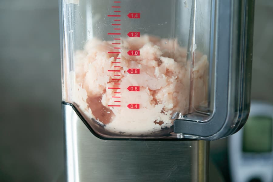 Куриные грудки произвольно нарезали на 4-5 частей, сложили на дно кувшина и запустили блендер. Сначала на 2-й скорости, потом постепенно дошли до 4-й. Через 25 секунд целых кусочков курицы в кувшине видно уже не было, зато появился технический запах от самого блендера.