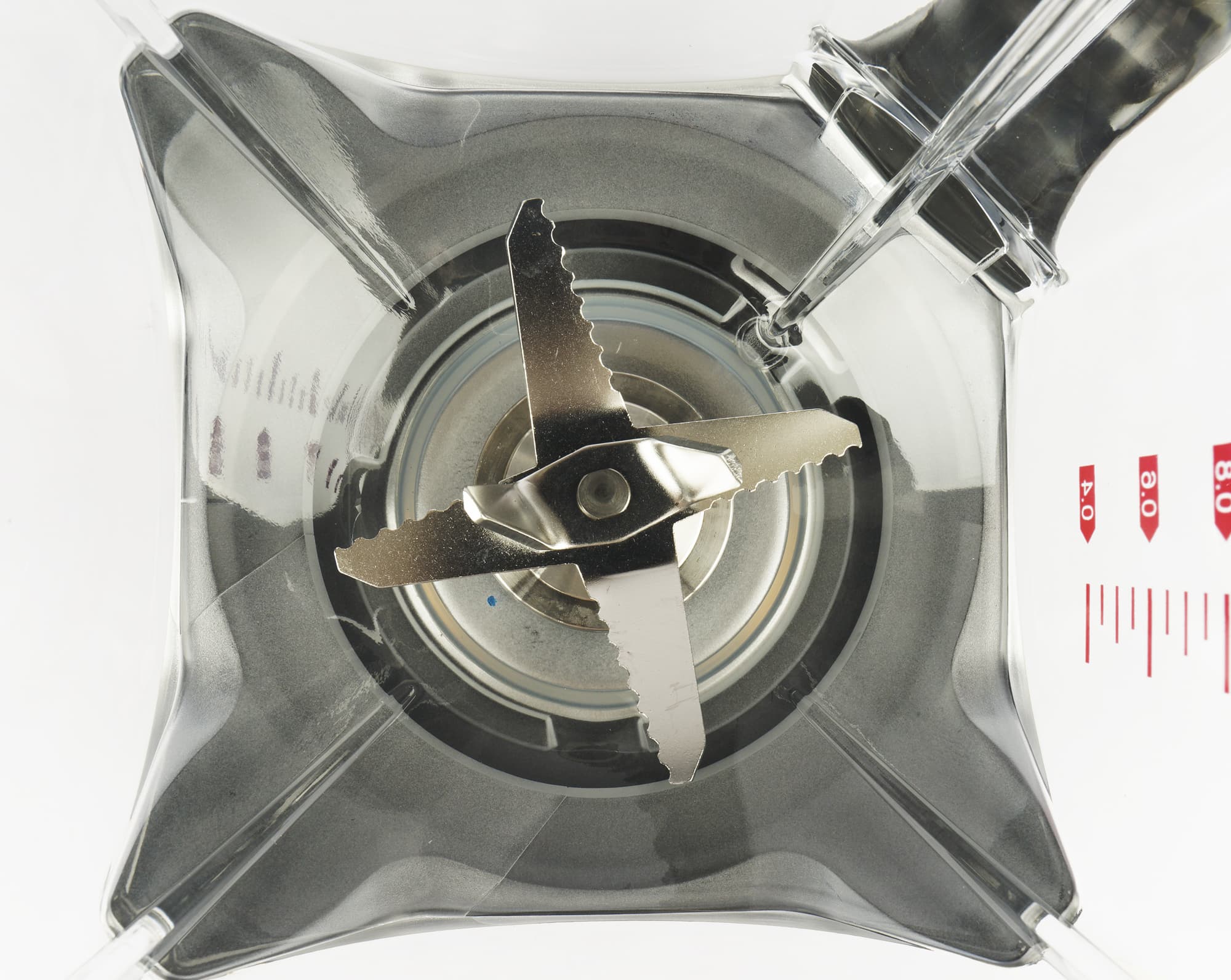 Несъемный ножевой блок из нержавеющей стали состоит из шести лезвий, расположенных на трех уровнях. Первые два с зубцами параллельны дну, вторые немного загнуты вверх и еще два почти перпендикулярны основанию.