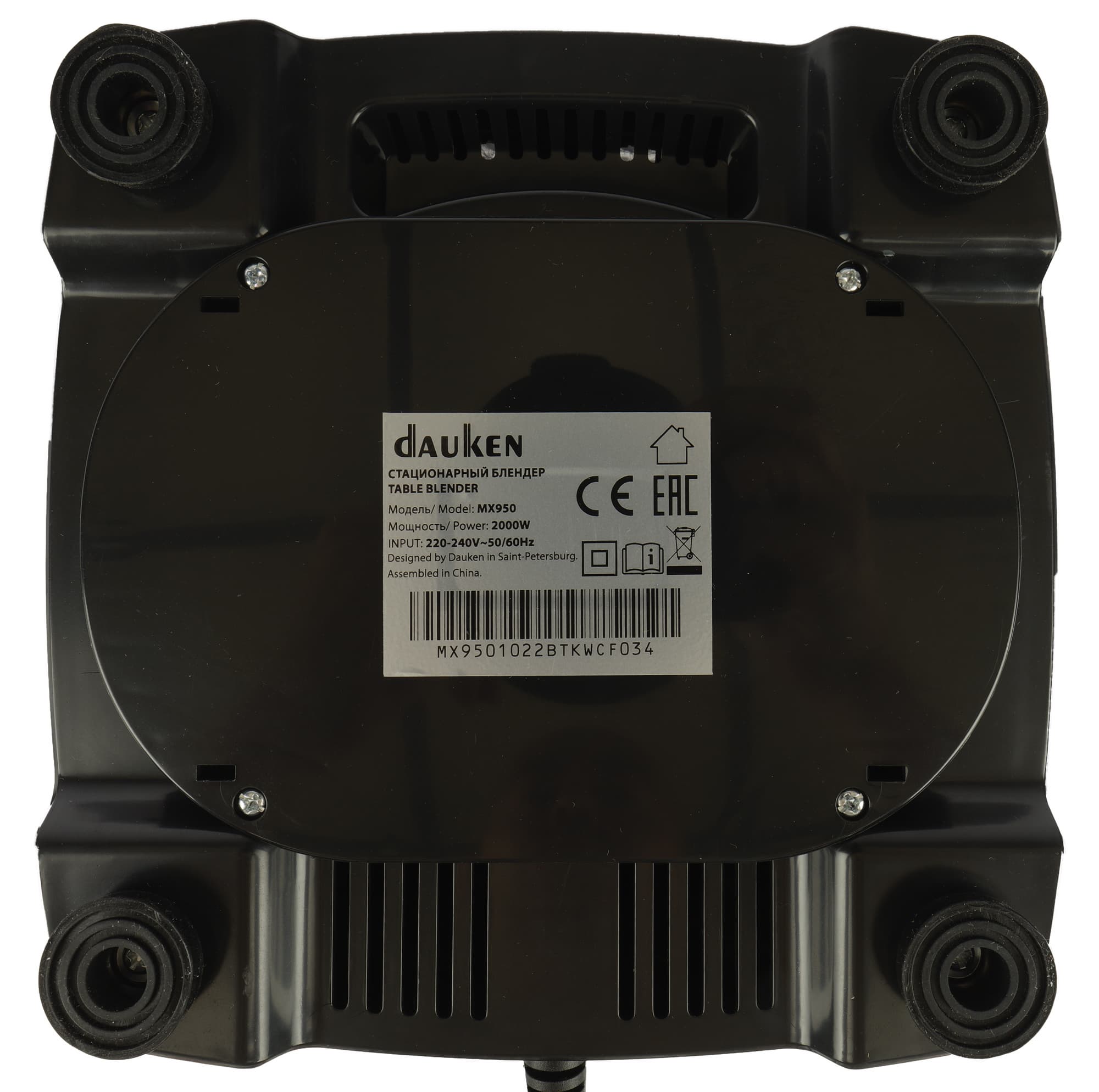 За счет немалого веса и четырех прорезиненных ножек на столе блендер держится очень устойчиво. На дне кроме ножек размещены вентиляционные отверстия и шильдик с технической информацией. Метровый шнур электропитания выходит с тыльной стороны корпуса.