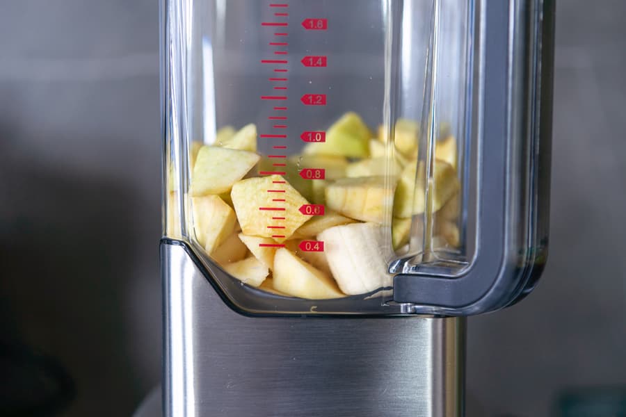 Закинули в кувшин нарезанные бананы, сверху яблоки и измельчили их в однородное густое пюре за 1 минуту 20 секунд. Блендер работал на 3-й скорости.