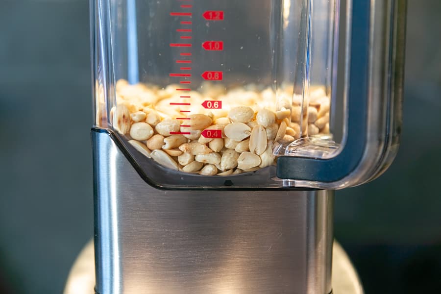 Арахис предварительно обжарили и почистили. Засыпали в кувшин и стали подбирать скорость.